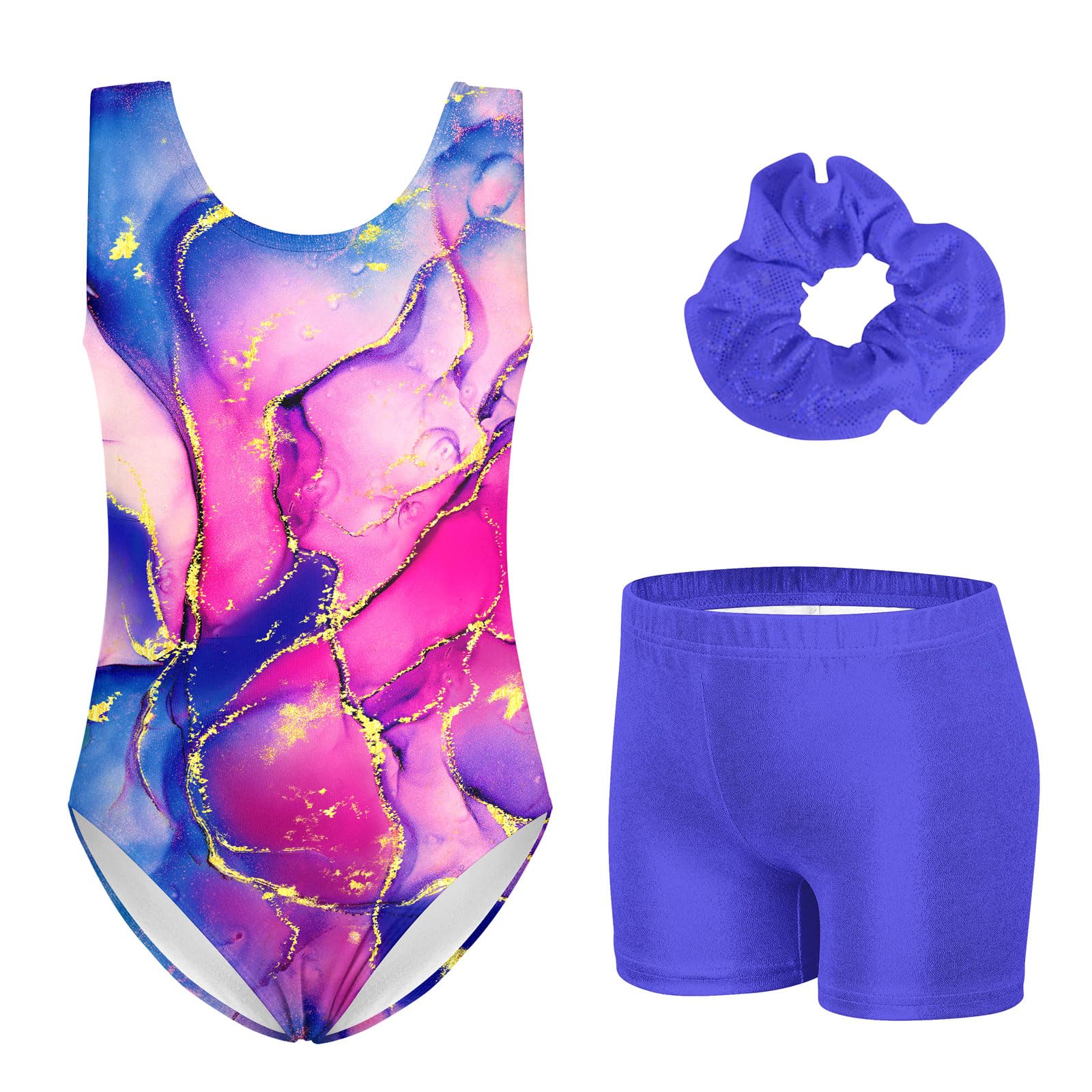 Kid Gymnastics Leotards Size 4 Little Girls Blue Pink Marble Gym Biketards with Matching Scrunchie for 4t 5t Child Drift Tie-dyed 3PCS 3d Print Elastic Sparkle Tumbling Sport Unitards,Size 4 5