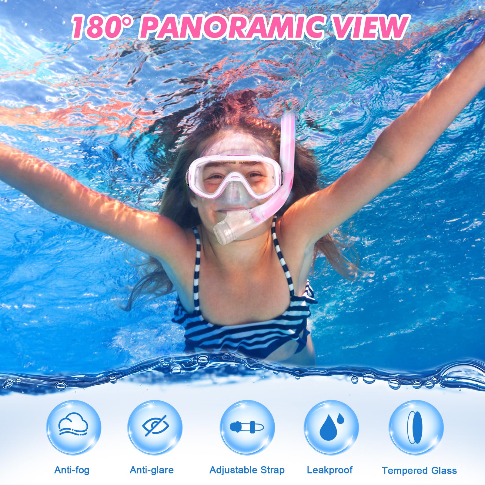 Kids Snorkel Set, Children Anti-Fog Diving Mask Swimming Goggles Full Dry Top Snorkel Equipment Snorkeling Packages Swimming Gear for Youth Boys Girls Age 5-10 (Pink White)