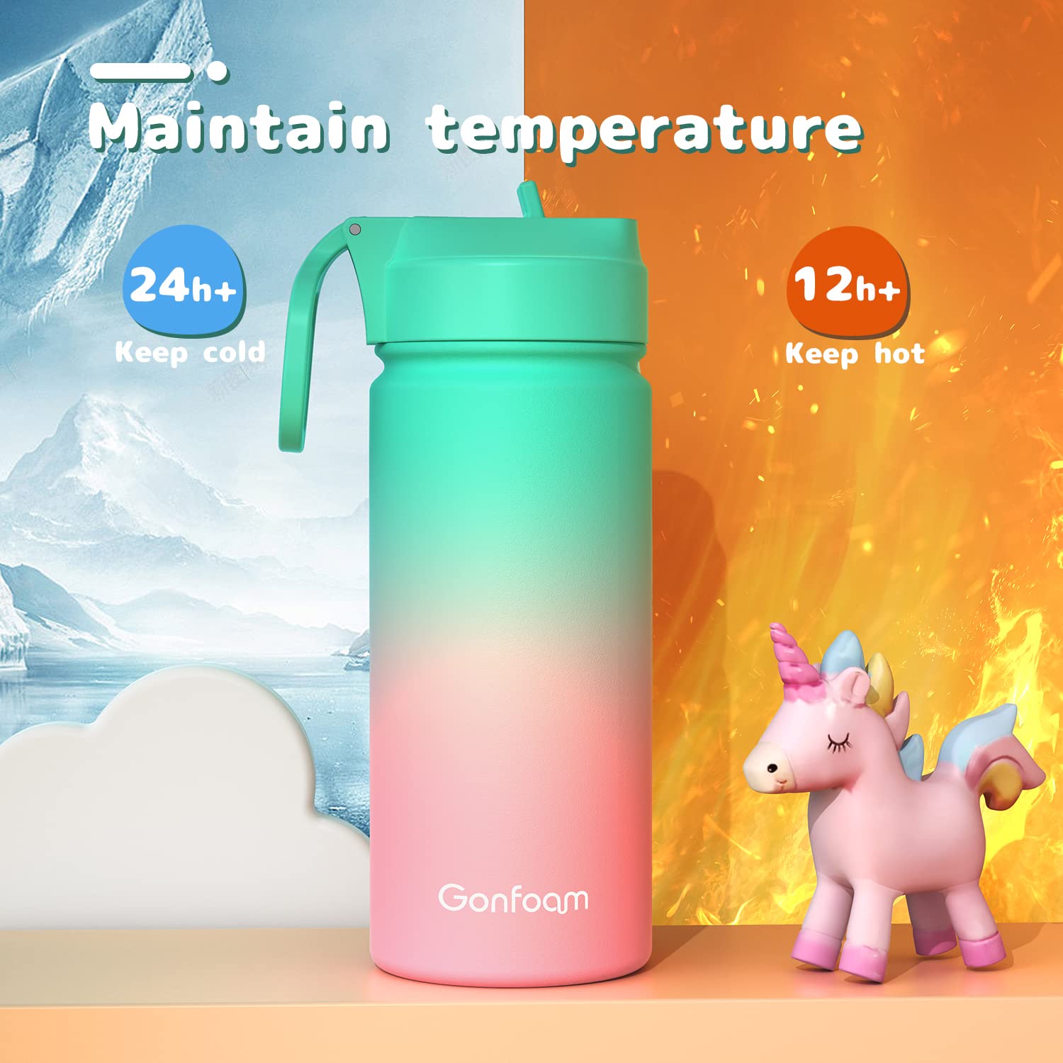 • Insulation and Leakproof: This insulated water bottle has a thickened sealing ring, so it is 100% leak-proof. Designed with double wall vacuum insulation, cold drinks can be kept for more than 24 hours and hot drinks can be kept for more than 12 hours to ensure your child gets the suitable temperature of water.