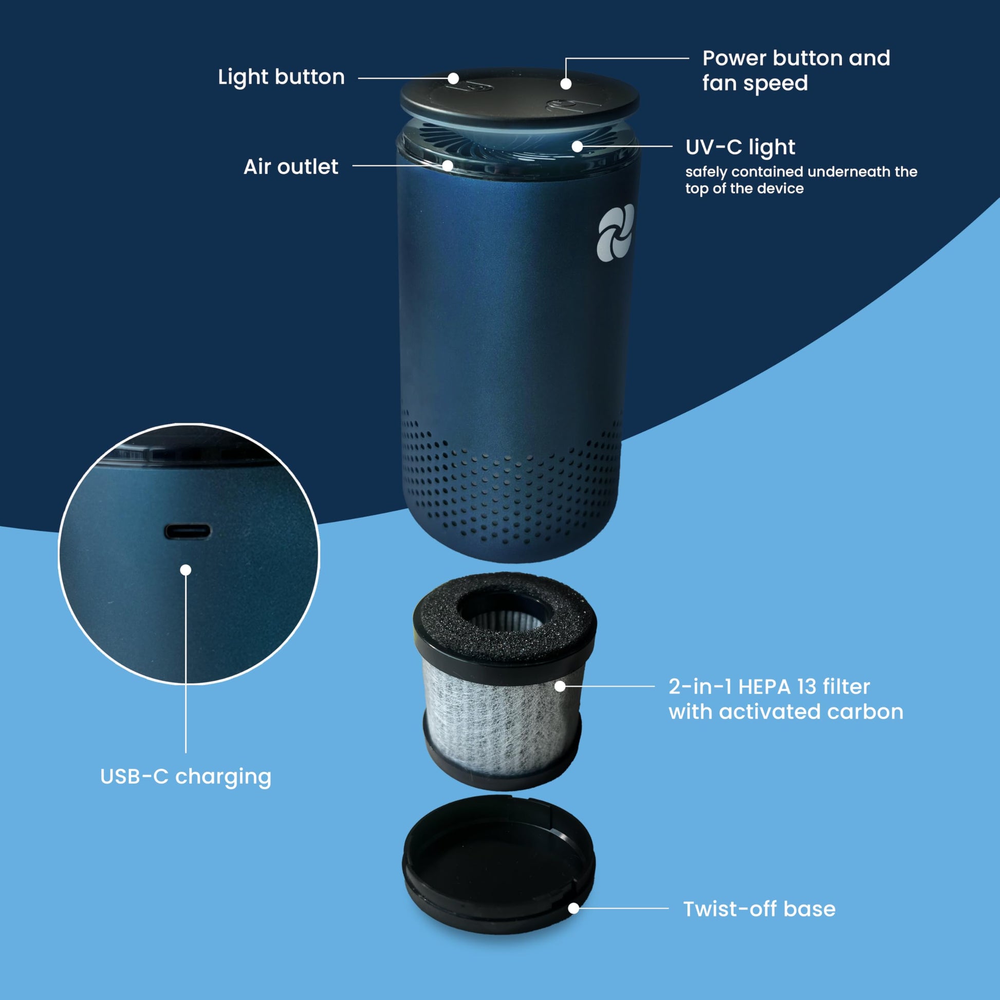 • UP TO 12 HOURS BATTERY LIFE - Using the provided USB-C cable, you can fully charge your 1800mAh battery in about three and a half hours and use your air purifier for up to 12 hours.