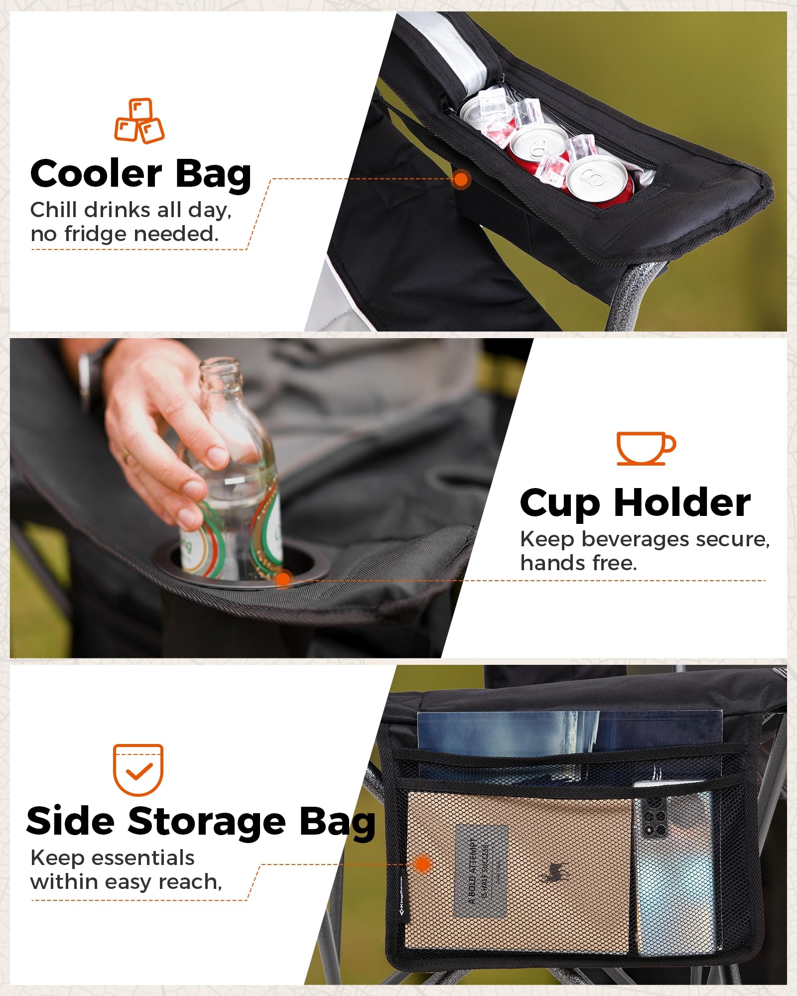 KingCamp Oversized Camping Folding Chair, Heavy Duty 450 LBS with Lumbar Support, Padded seat with Cup Holder&Cooler Bag, Ideal for Camp, Fishing, Sports Event, Backyard, Patio, Lawn (Black/Grey)