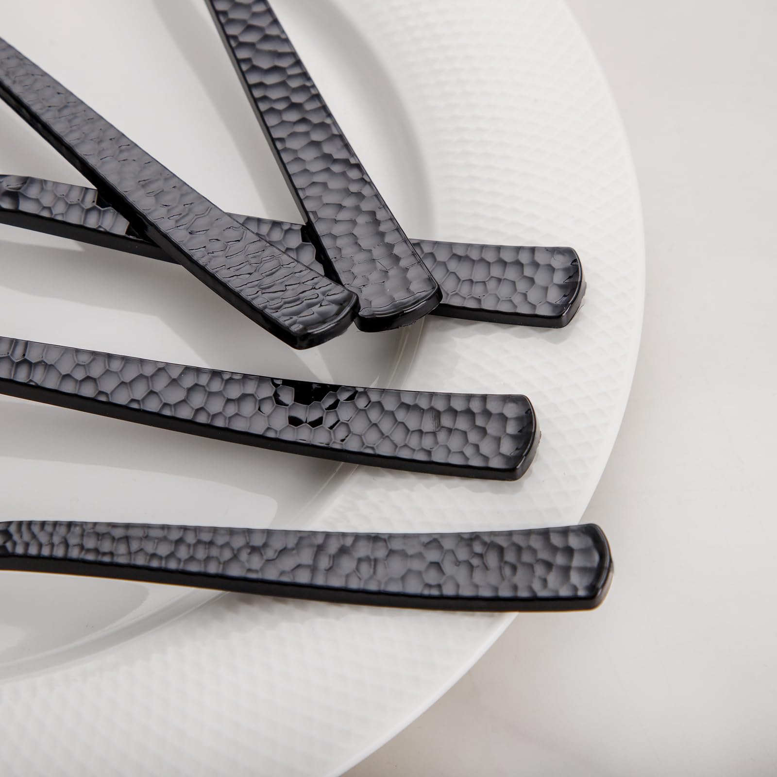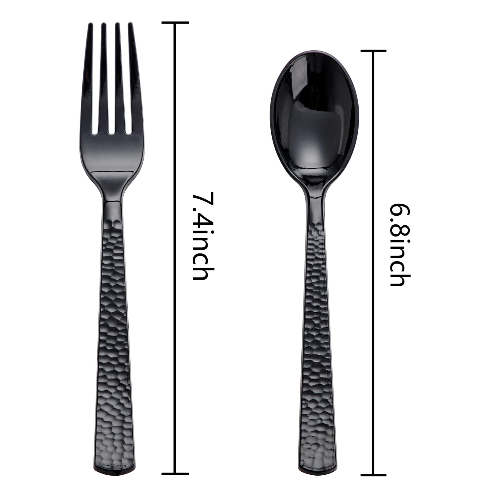• ELEGANT DESIGN: 400 pieces of plastic forks and spoons are black, brings a touch of grace to your posh party set up! black hammered forks and spoons have a unique design and classic look that is much more attractive