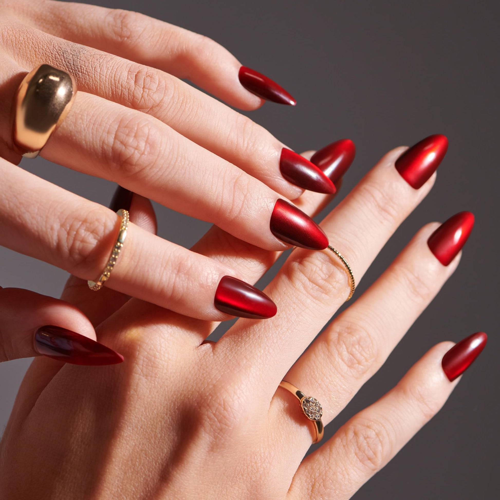 KISS Gel Fantasy Magnetic Press On Nails Almond, Solid Red, Medium Length, 28 Fake Nails, Pink Gel Nail Glue (Net Wt. 2 G / 0.07oz.), Manicure Stick, and Mini Nail File