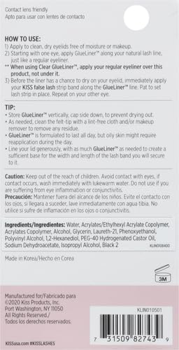 Details: All that was tricky about gluing on false eyelashes is a thing of the past! Kiss Lash GLUEliner makes false eyelash application absolutely foolproof! No more messy eyelash adhesives to deal with - applies like eyeliner, dries like glue. This lash glue glides flawlessly along your lash line using the fine point felt tip applicator, ready for your favorite falsies to adhere to in a seamless way. As easy as 1-2-3, simply line your lid generously with as much GLUEliner as needed.