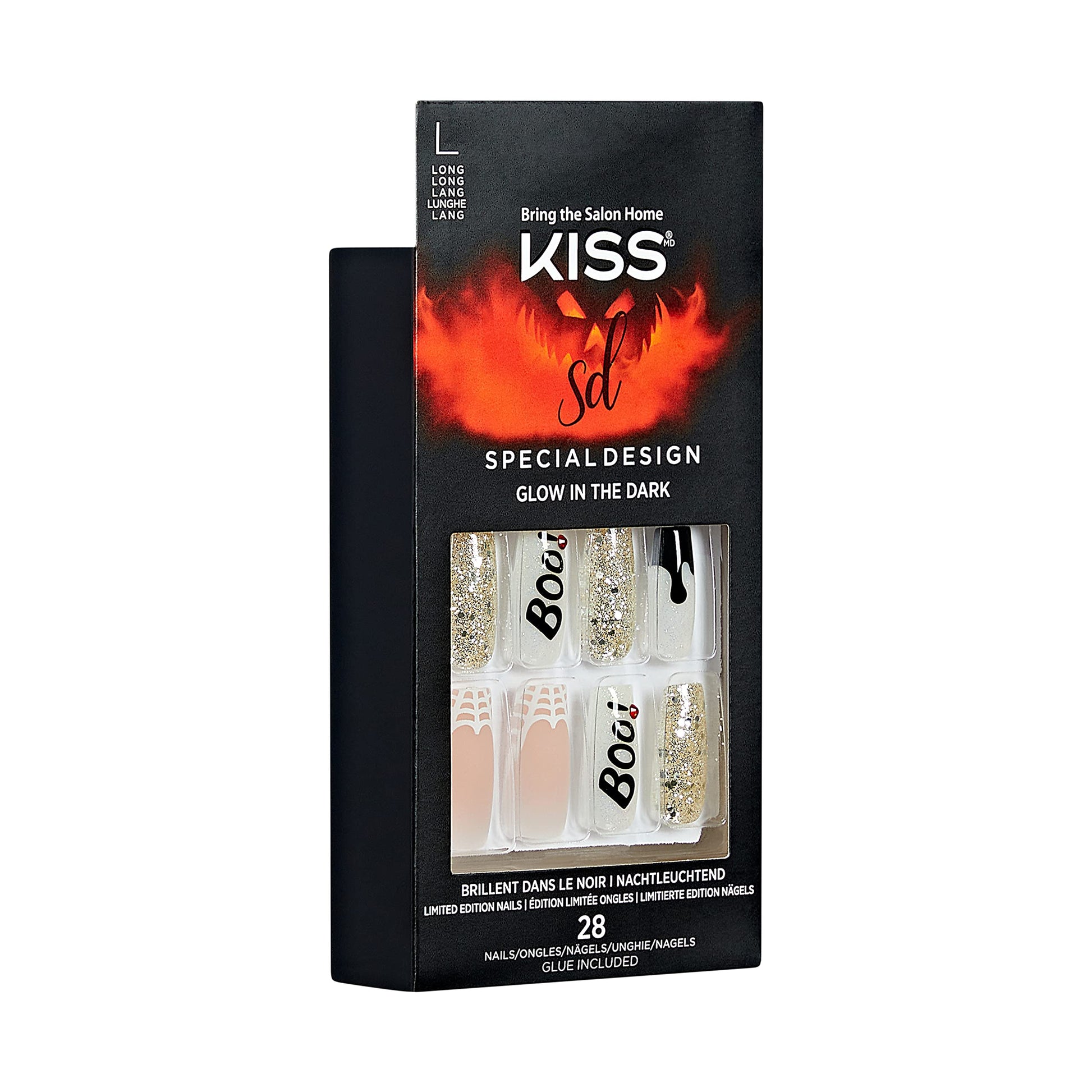 Details: Limited Edition fake nails that glow in the dark are here. One-of-a-kind manicures make you look spellbindingly beautiful. Created exclusively for KISS by top professional nail artists & social influencers. KISS false nails feature a delightfully devilish array of Halloween styles. Matte and glossy finishes in various sizes, shapes & colors with festive accents. Spare yourself a schlep to the salon. DIY false nails save you time and money. Solid nail polish colors, glossy, matte, 3D, and glow-in-the-dark finishes, all with the spookiest themed designs ever. Easy to glue on or press on. Nails will look bewitching literally in minutes & stay put for up to a week. 28 nails in 12 sizes; Find the most comfortable fit for you. Nail kit includes 24 adhesive tabs, pink gel nail glue (Net wt. 2 g / 0.07oz.), mini file, manicure stick & 28 false nails in the latest fashion-forward colors & styles. KISS nails never dull or chip & no dry time is required. Waterproof to withstand frequent hand washing. KISS brings the salon home with nail art, nail polish, gel manicures, press-on nails, nail glue, acrylic nails, & nail tips.