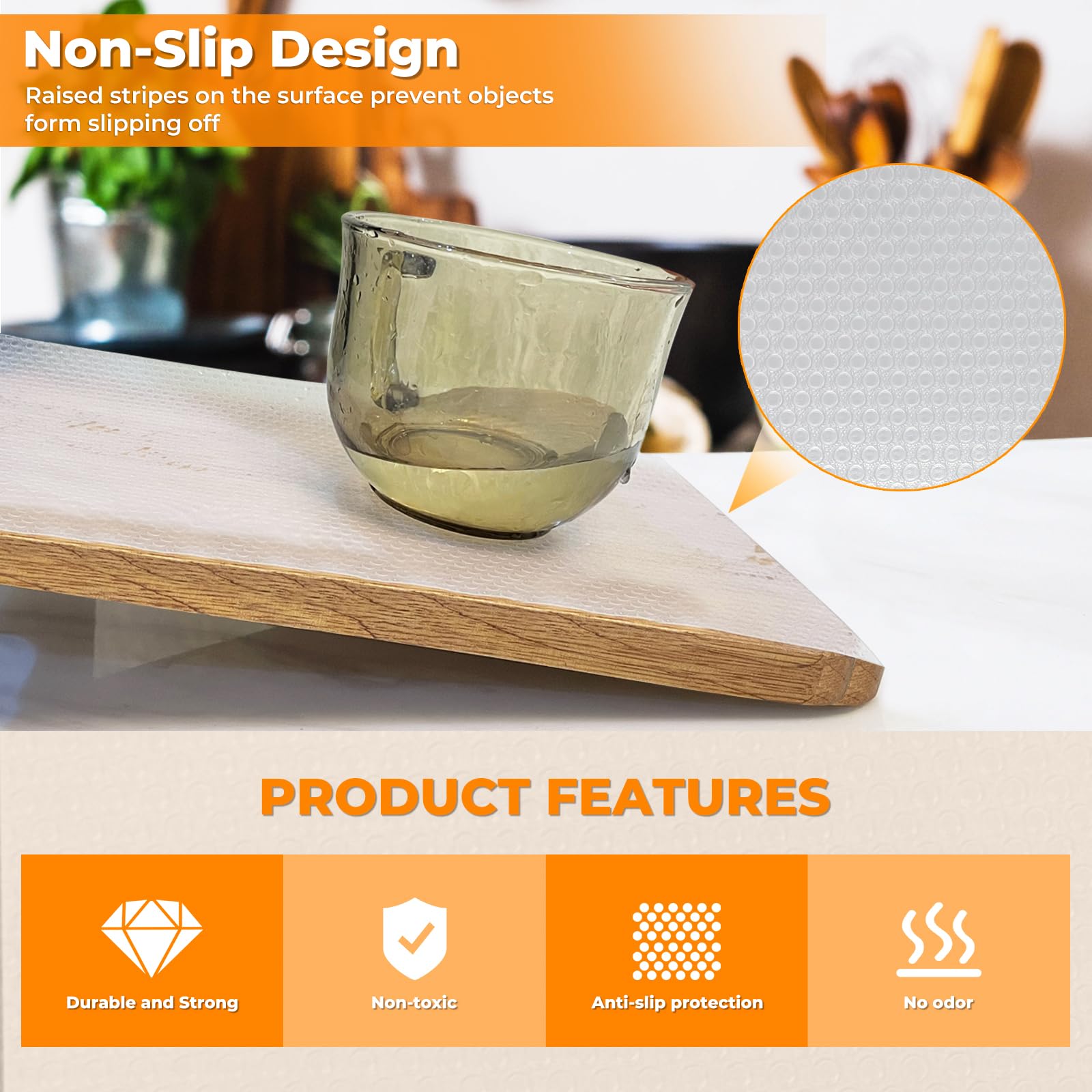 • 【Non-Slip Design】This clear shelf liner surface uses a special Convex dots design, which can effectively prevent glass, tableware or other fragile items from slipping off the tabletop.