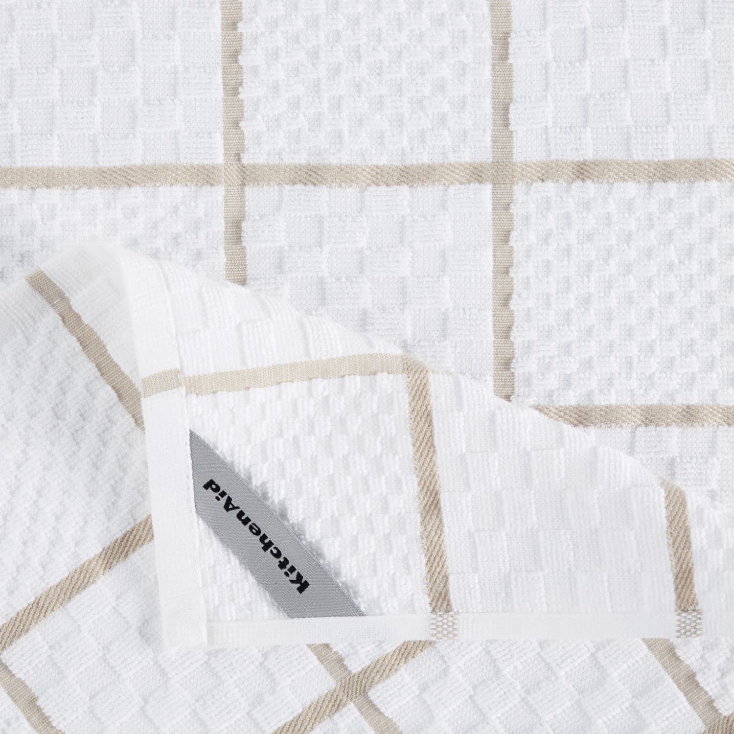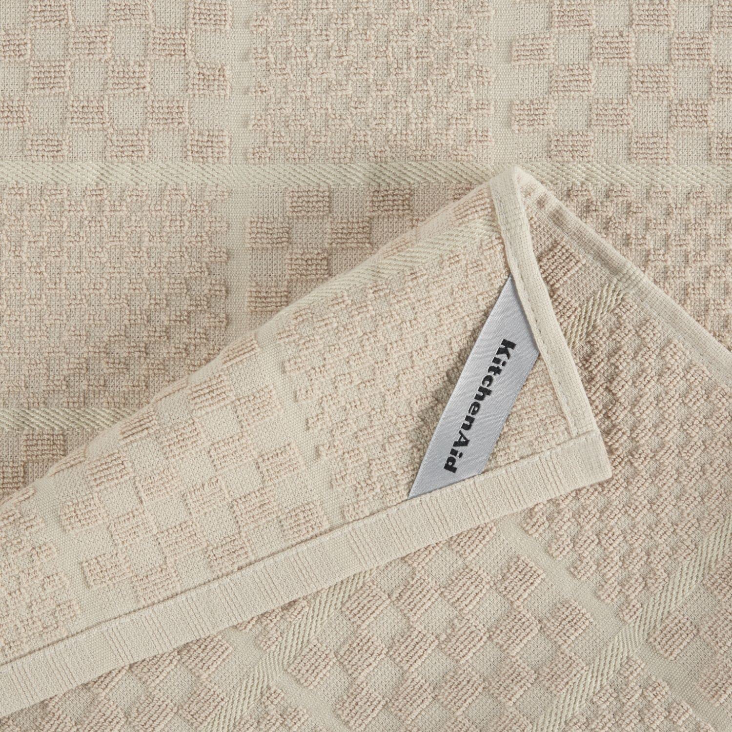 Details: Easily refresh your kitchen essentials with the KitchenAid Quilted Cotton Terry Cloth 4-Pack Set. Including one double-lined oven mitt, one thick pot holder and two absorbent kitchen towels, this giftable 4-piece kitchen set will help take on any task in the kitchen. The oven mitt and pot holders are quilted with thick cotton and terry cloth lining for high heat resistance and ultimate comfort. A flexible non-slip silicone grip allows you to easily hold hot pots and pans while cooking. Each kitchen towel is textured with thick, absorbent terrycloth ideal for soaking up spills or drying dishes. Machine wash for easy care. Hang dry with decorate loops or lay flat to dry.