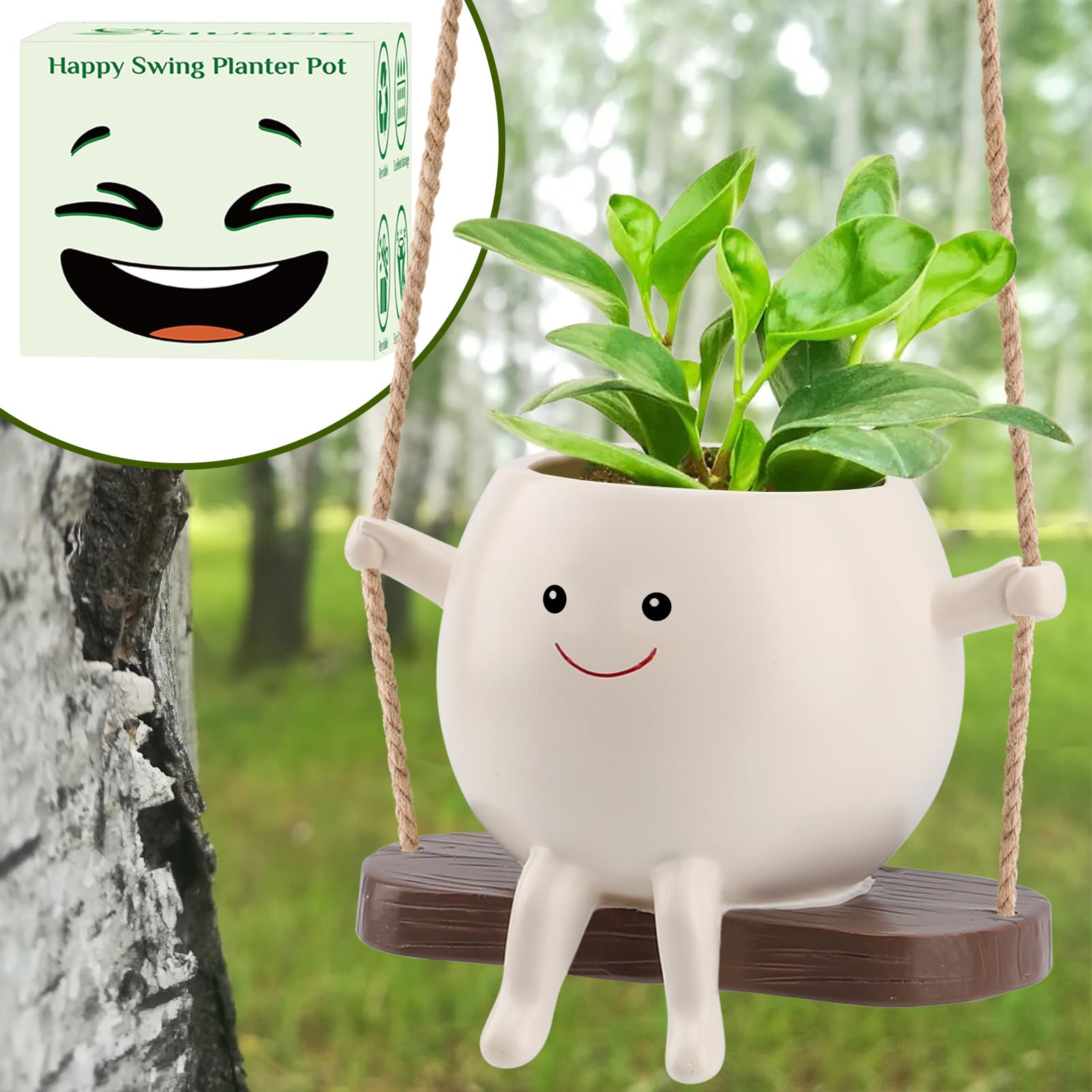 • DIY Design: KIUGCO Hanging flower pot looks like a carefree little person sitting on a swing. Perhaps it wants to cover up its baldness with a polite smile. So please unleash your creativity to help it, plant your favorite succulent plant as its fluttering hair, and bring a fluttering green color to your garden or room