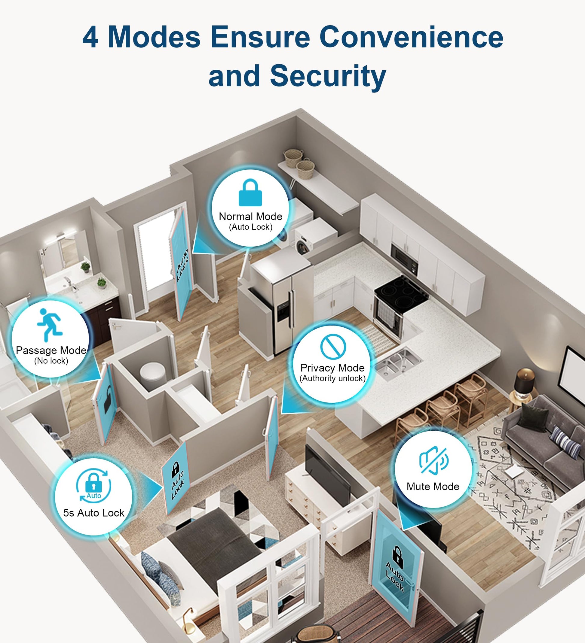 • THREE MODES FINGERPRINT DOOR KNOB: Designed to provide convenience and enhanced privacy to homeowners. Easily switch modes by rotating your thumbprint around the smart door knob. The modes are passage mode, entrance mode, and privacy mode. Perfect bedroom door knobs with lock to keep unwanted guests like roommates or kids from entering your peaceful space.