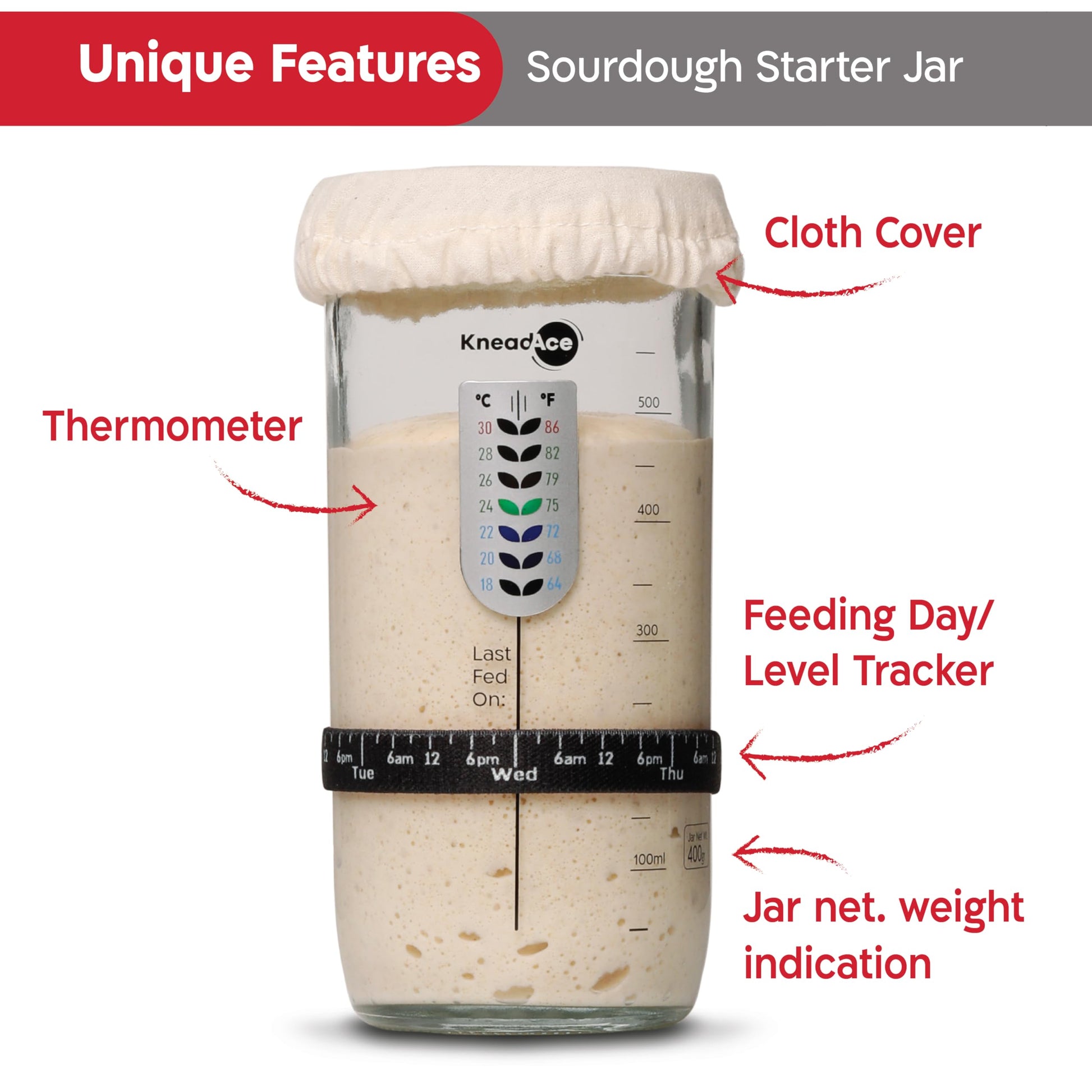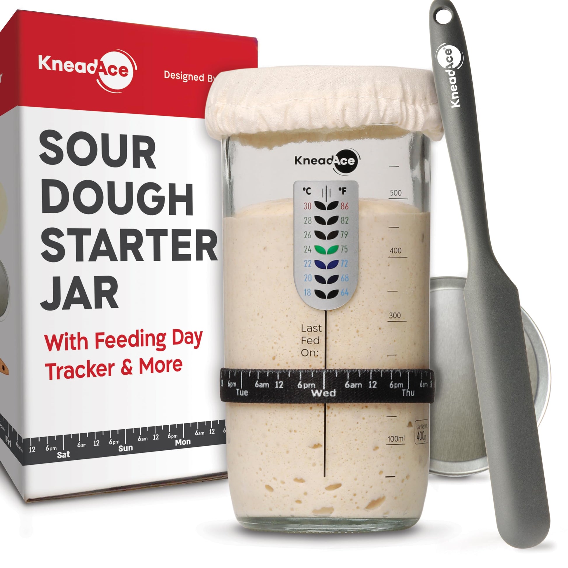 KneadAce Sourdough Starter Jar With Date Marked Feeding Band, Thermometer, Sourdough Jar Scraper, Sourdough Container Sewn Cloth Cover & Metal Lid, Sourdough Starter Kit