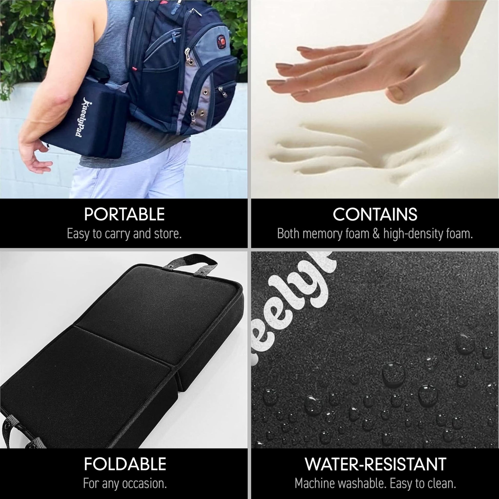 • DURABLE AND EASY TO CLEAN - Our high-quality, impact-resistant memory foam won’t compress or lose its shape over time. The breathable, water- and sweat-resistant neoprene cover makes KneelyPad ideal as a knee cushion for exercise, cleaning, or as a gardening kneeler. And since it’s machine washable, cleanups are a breeze!