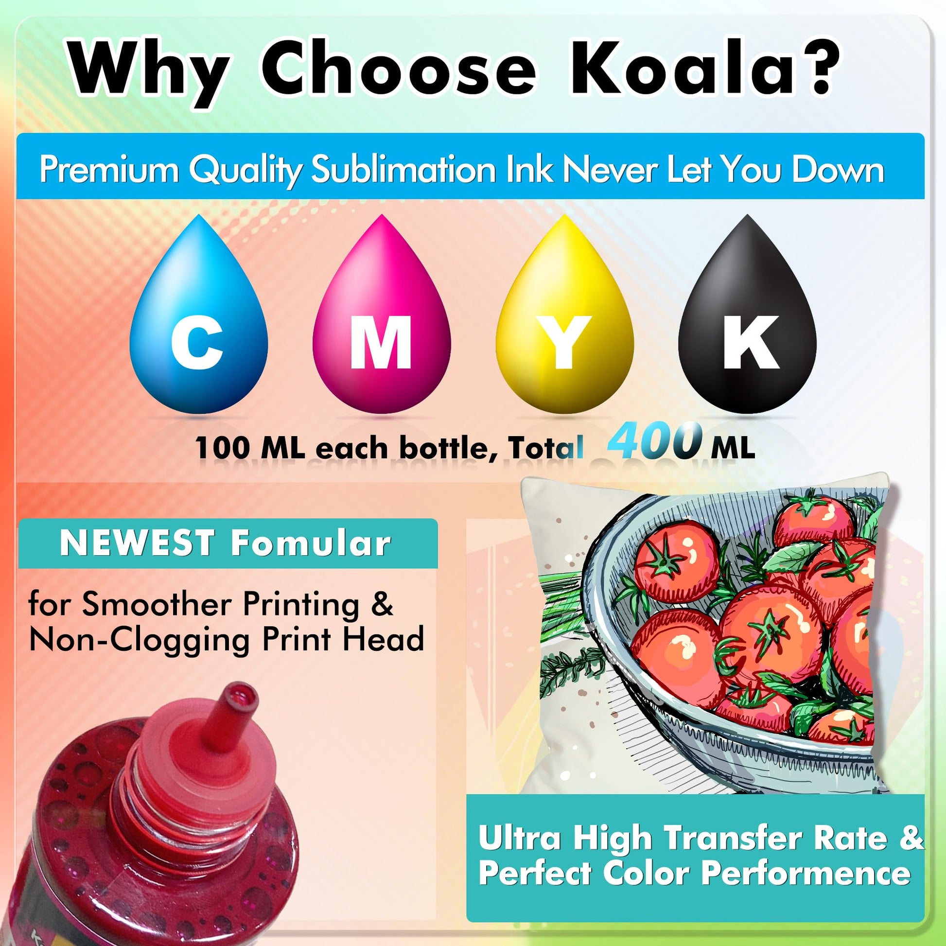 Koala Sublimation Ink Refill Bottle Compatible with ET-2720 ET-2760 ET-2800 ET-2803 ET-2850 ET-3760 WF-7710 WF-7720 C68 C88 for Heat Transfer on Mugs, Polyester Shirts, Mat, etc
