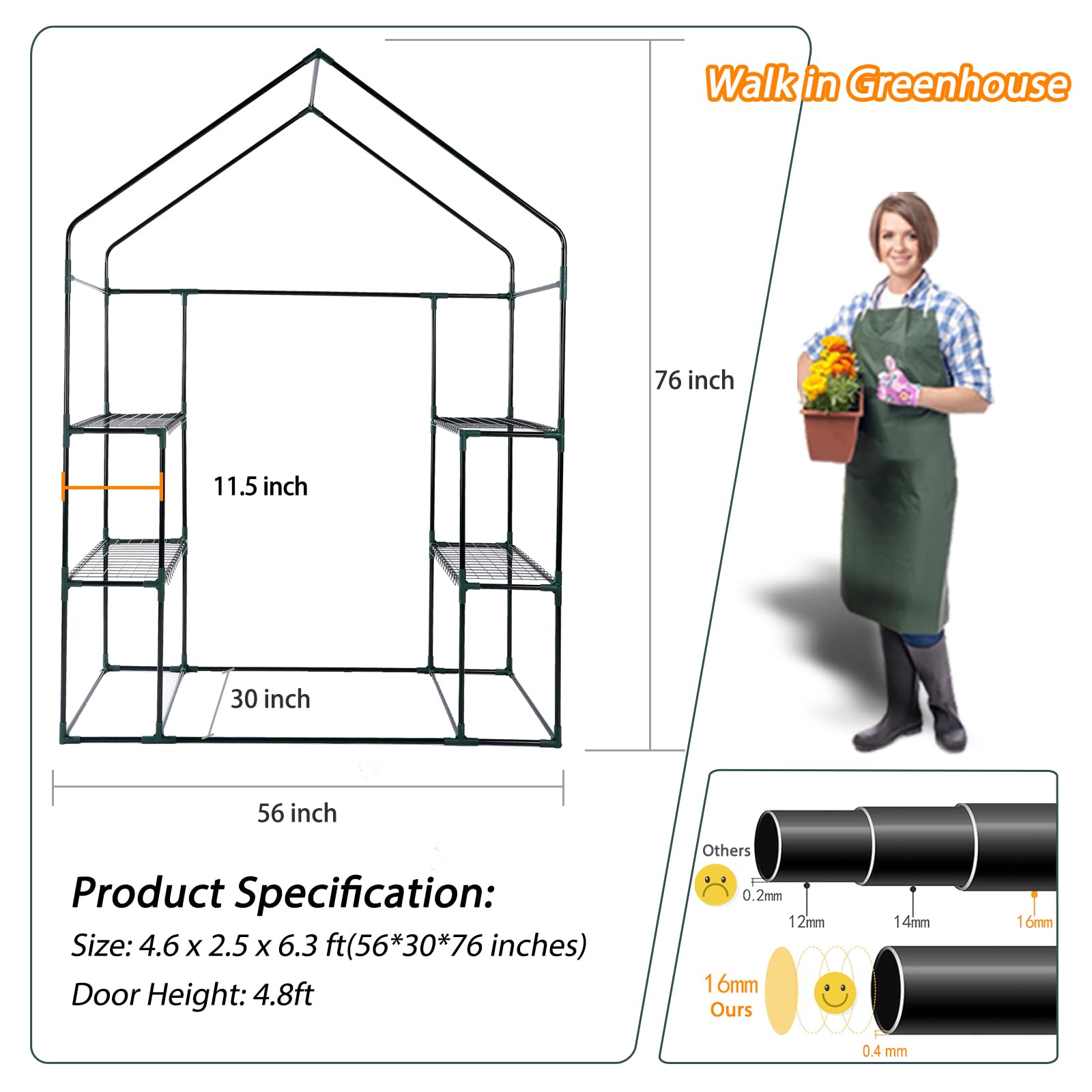 • MINI GREENHOUSE LARGE SPACE: This 3-Tier small walk-in greenhouse is 56 inch long, 30 inch wide, and 76 inch high. The door is 5.25ft high,so adults can enter and exit easily. Floor 1 and 2 are 16.5 inch high and 11.5 inch wide. Each shelf space allows about a dozen plant pots at once.