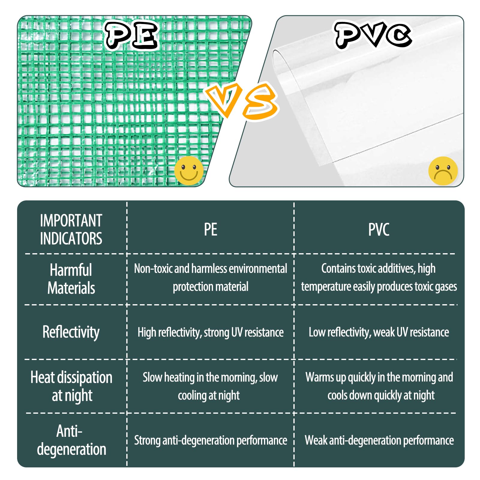 • ECO-FRIENDLY PE COVER: PE green cover is odorless, non-toxic, low-temperature resistance, acid, alkali corrosion resistance, aging resistance. lets in a lot of heat but doesn't burn the seedlings as the clear covers have done.