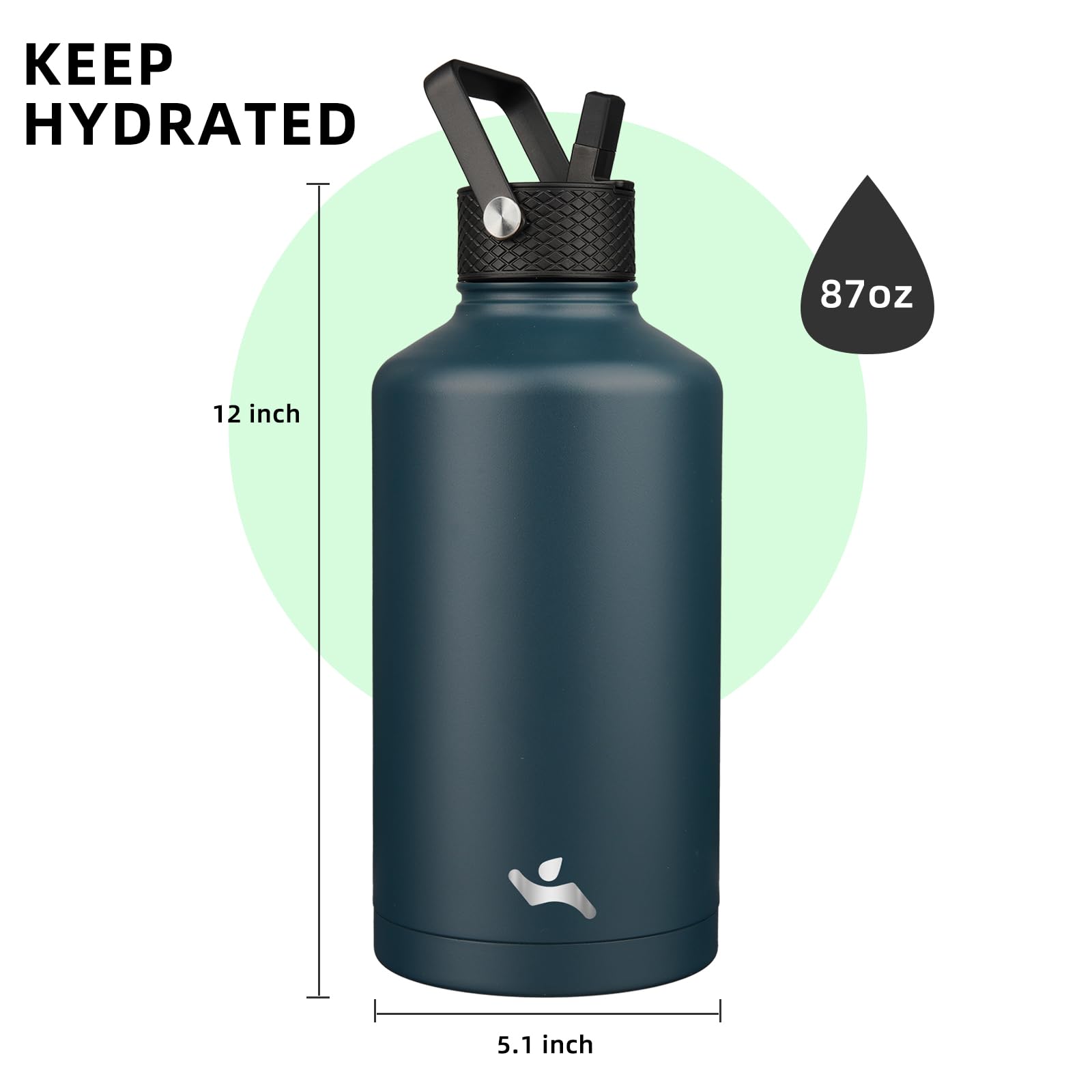 Konokyo Insulated Water Bottle with Straw,87 oz 3 Lids Water Jug with Carrying Bag,Paracord Handle,Double Wall Vacuum Stainless Steel Metal Flask,Navy Blue