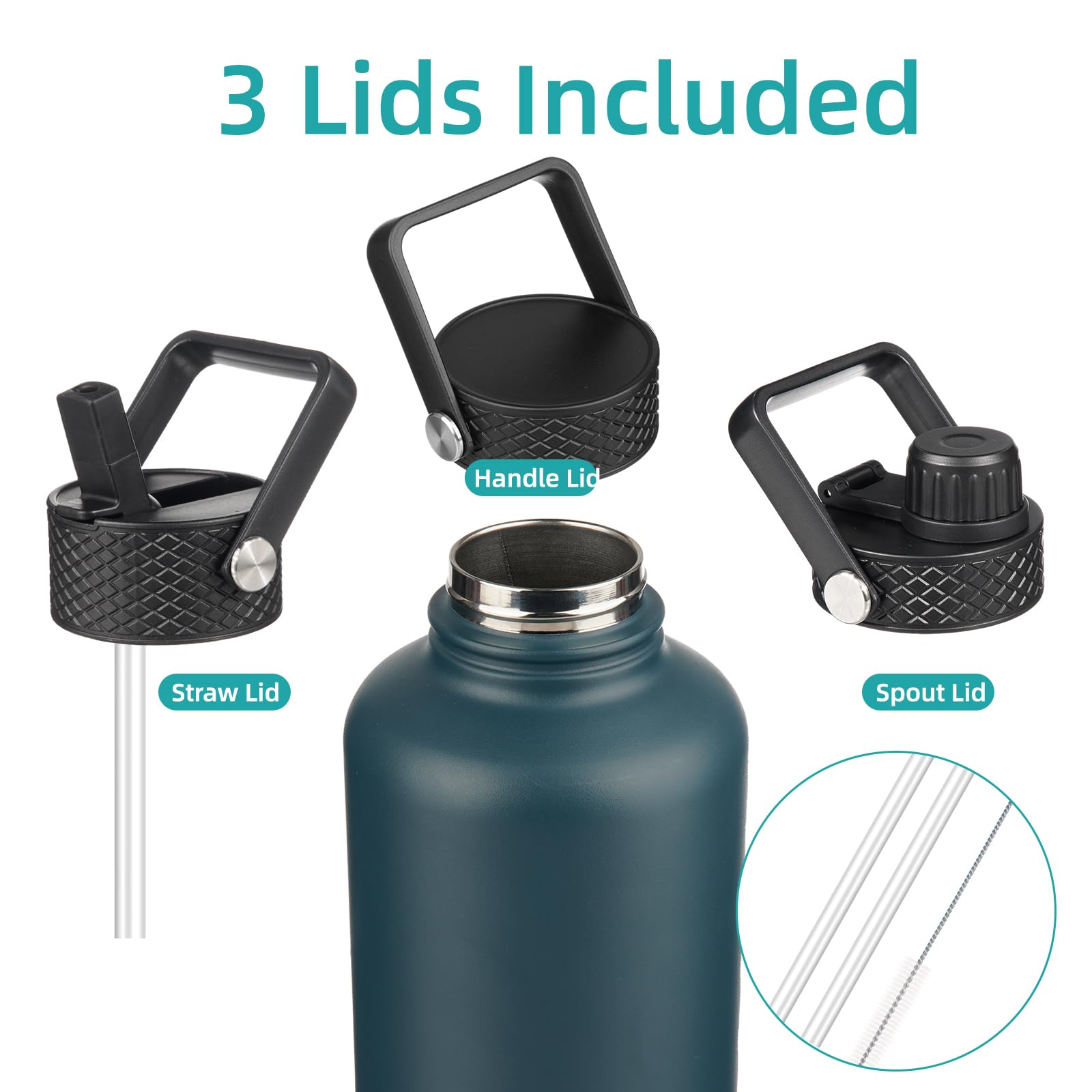 • The water bottle comes with 3 lids for different beverages, a sip lid for hot drinks, a straw lid for iced beverages, a flex-removable lid(2 different handle lids ship at random) for smoothies or fruit drinks. All lids are BPA-free, leak-proof, and dust-proof, catering to your need