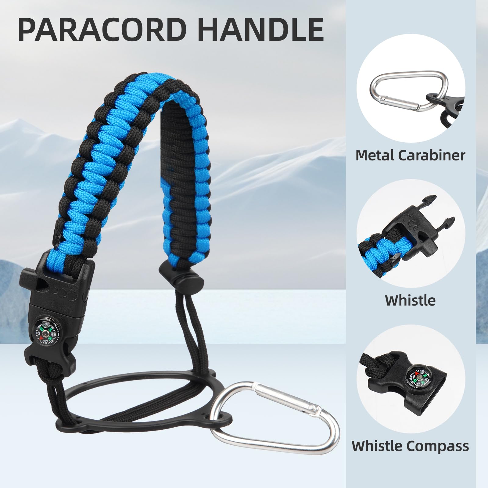• The large capacity gallon water jug comes in various sizes, including 50 oz, 64 oz, 87 oz, and 128 oz, with a range of colors to choose from according to your need. All sizes of bottles equip with a paracord handle and a pouch for easy carrying
