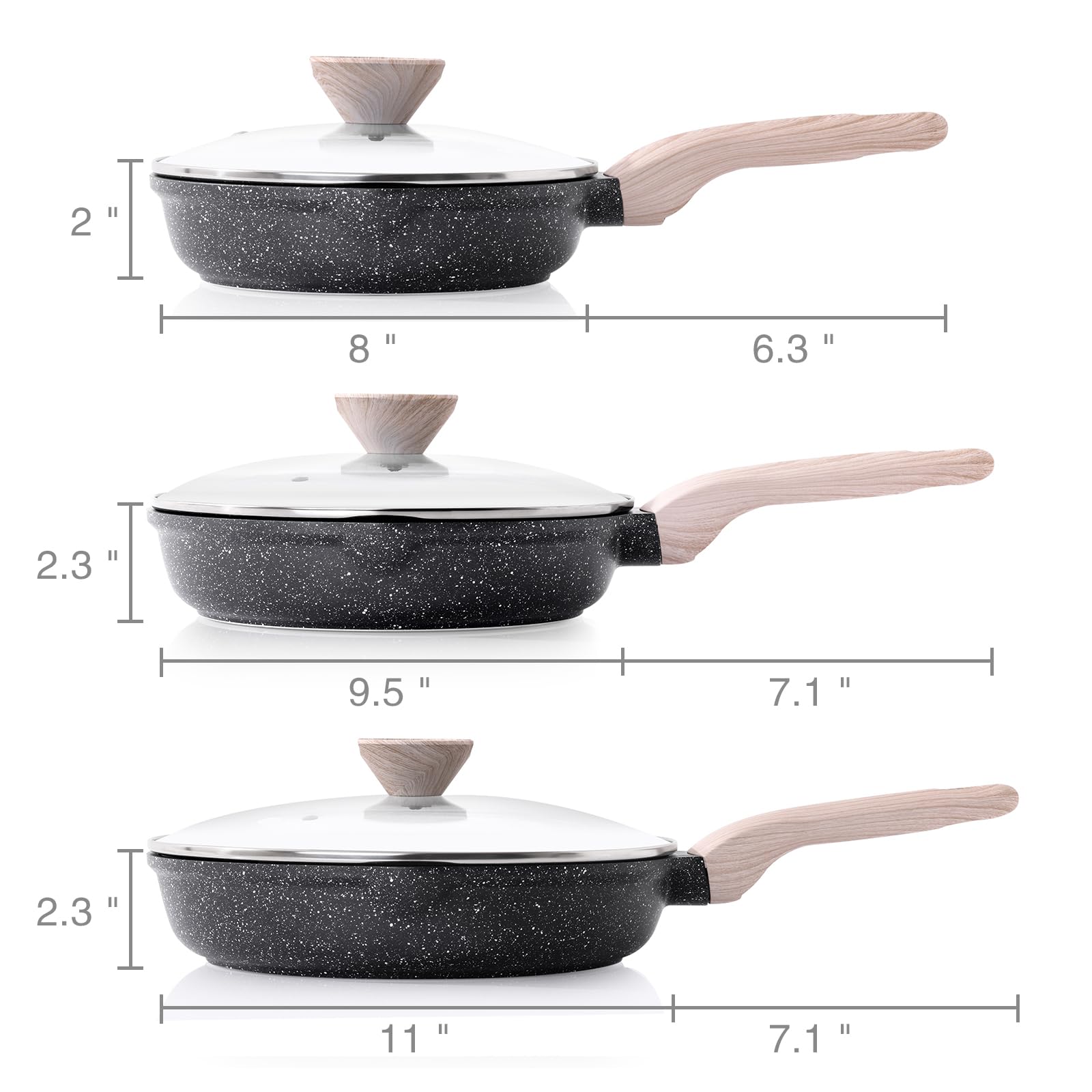 Kordisen Nonstick Frying Pan Set with Lids, 3 Piece Skillet Set, Healthy Induction Cooking Pan, Stay-Cool Handle, Compatible with All Stovetops, PFOA Free (8, 9.5, 11 Inch)