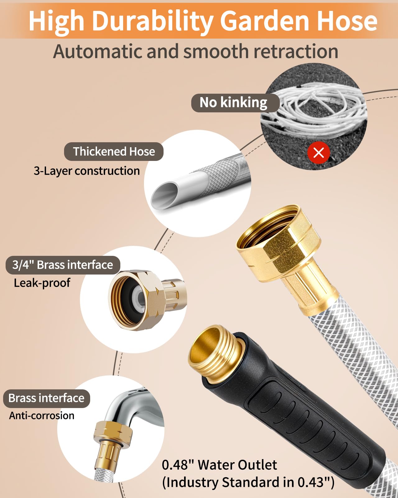 • 【Upgraded & Thickened Durable Retractable Hose】Our retractable outdoor hose reel wall mount is made of high-quality reinforced 3-layer composite material, and has passed the 200PSI pressure test, ensure the retractable hose reel is leak-proof and durable, equipped with rubber protective sleeve and 3/4' copper metal connects, it guarantees a leak-free performance.