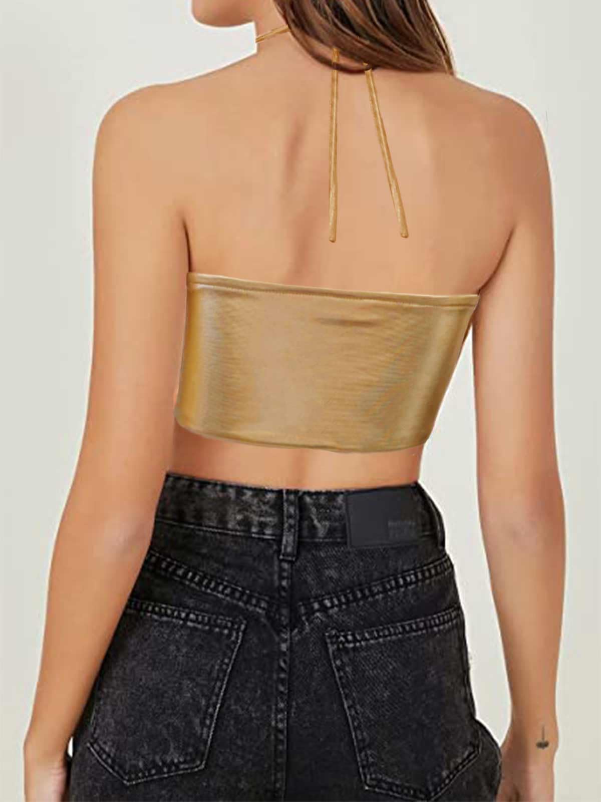 Krtwrnt Women's Gold Crop Halloween Bra Festival Clothing Halter Tie Bustier Space Cowgirl Sparkly Top Alien Costume Fairy Sexy Metallic Top S