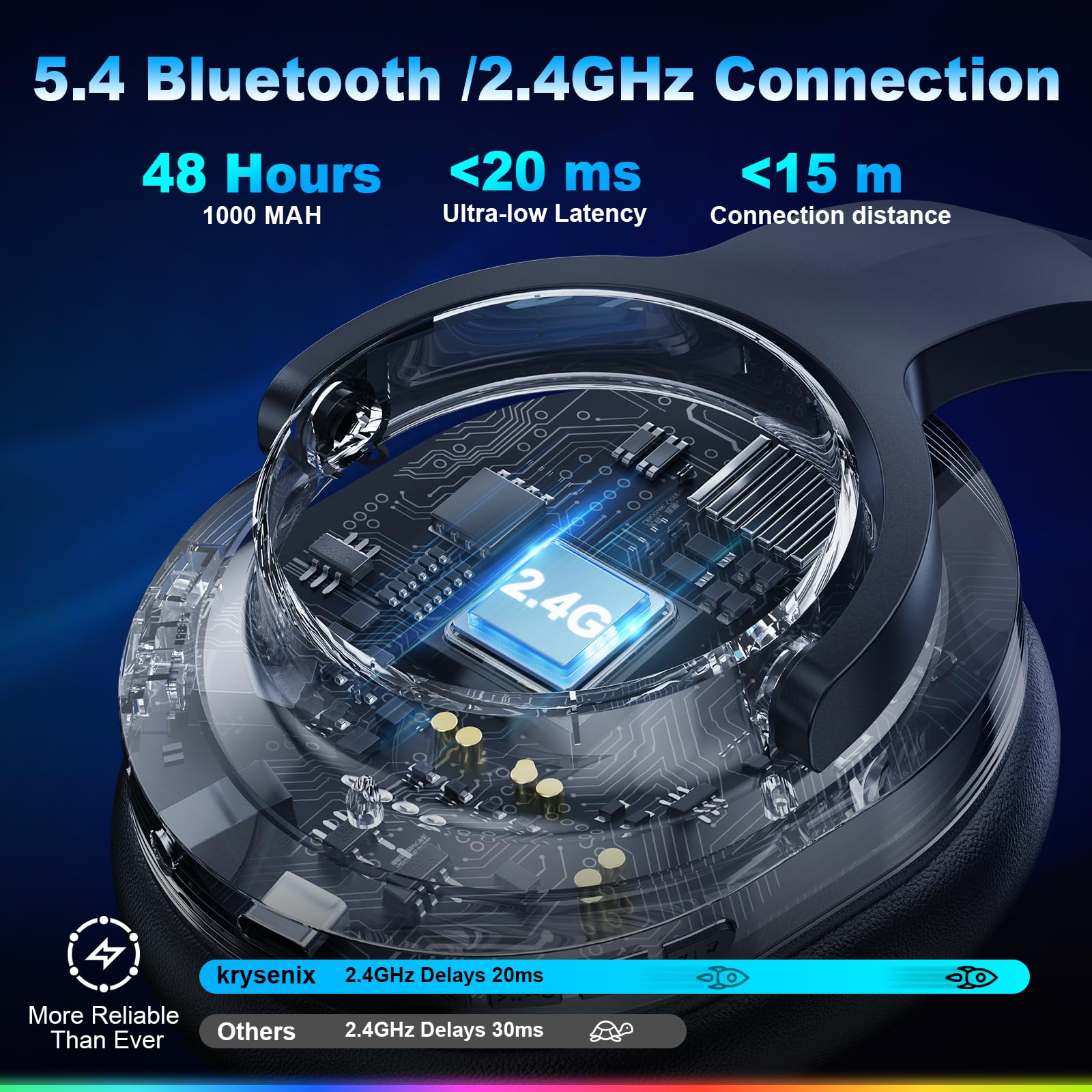 Krysenix PG3 Wireless Gaming Headset for PS4, PS5, PC - 2.4GHz 7.1 Surround Sound, Bluetooth Gaming Headphone with AI Detachable Noise Canceling Mic, 48-Hr Battery for Laptop, Switch, Mac (Black)