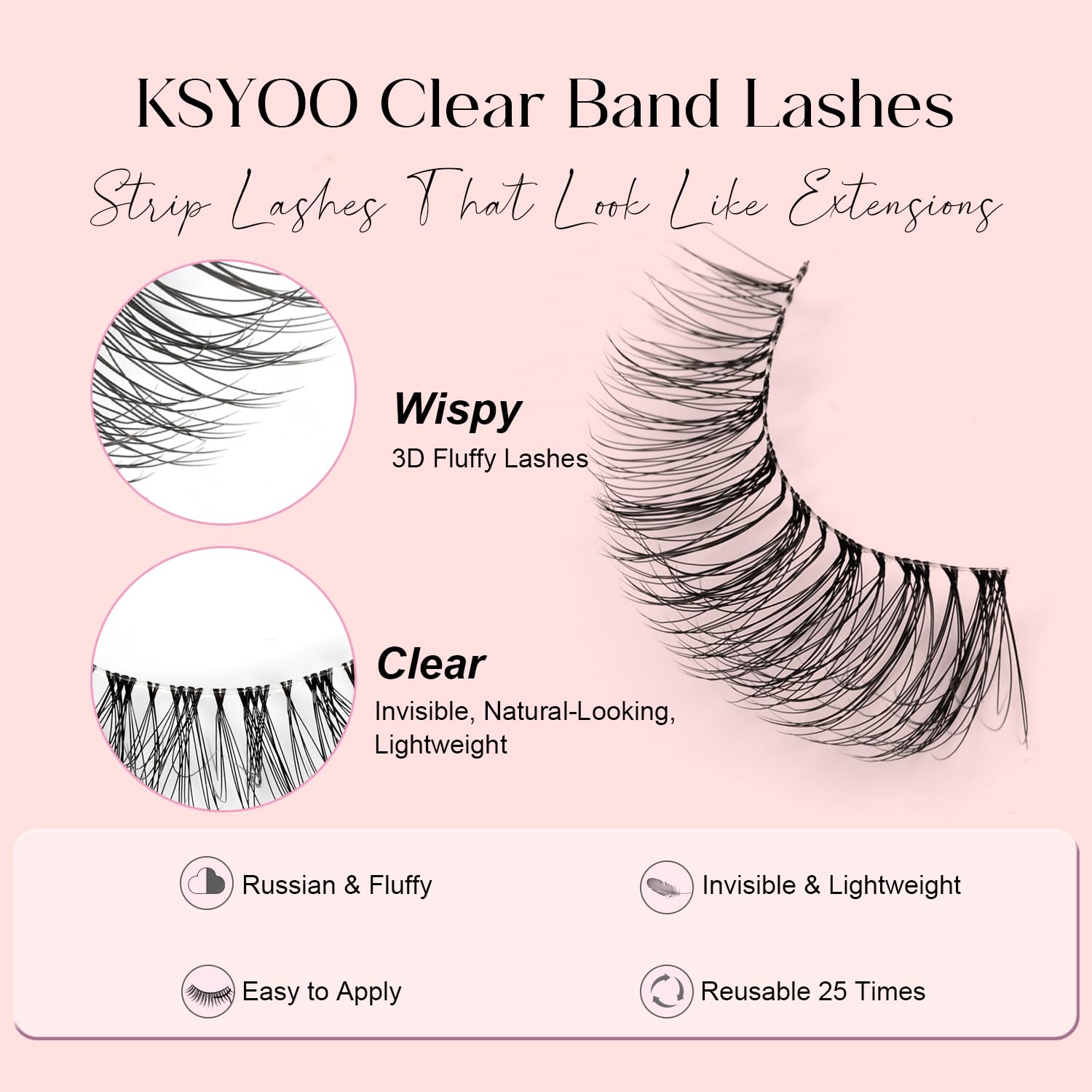 KSYOO Long Natural Lashes with Clear Band Lashes Wispy,10-18mm Cat Eye Lashes D Curl Strip Lashes That Look Like Extensions,3D Natural Fluffy Faux Mink False Eyelashes Natural Look