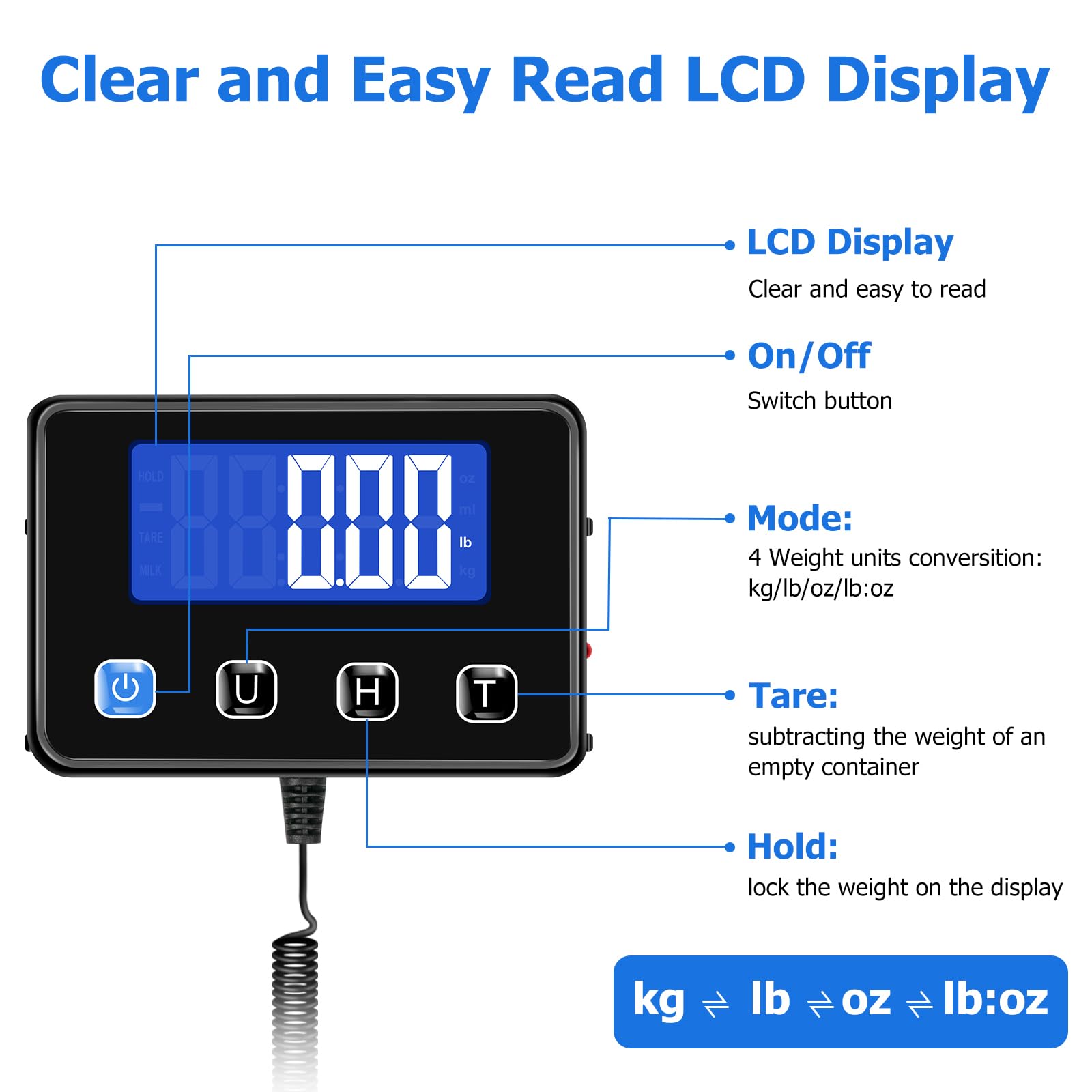 • LCD Display & 4 Units Convesition: The high-definition LCD screen with blue backlight and high-contrast display can clearly read the weight even in dim environments. It also has a retractable spring line and 2 back nail slots, and the wall-mounted design ensures that you can read the data without obstruction. In additiion, the scales for packages comes with 4 measurement units: LB, OZ, KG and LB:OZ to meet your different needs.