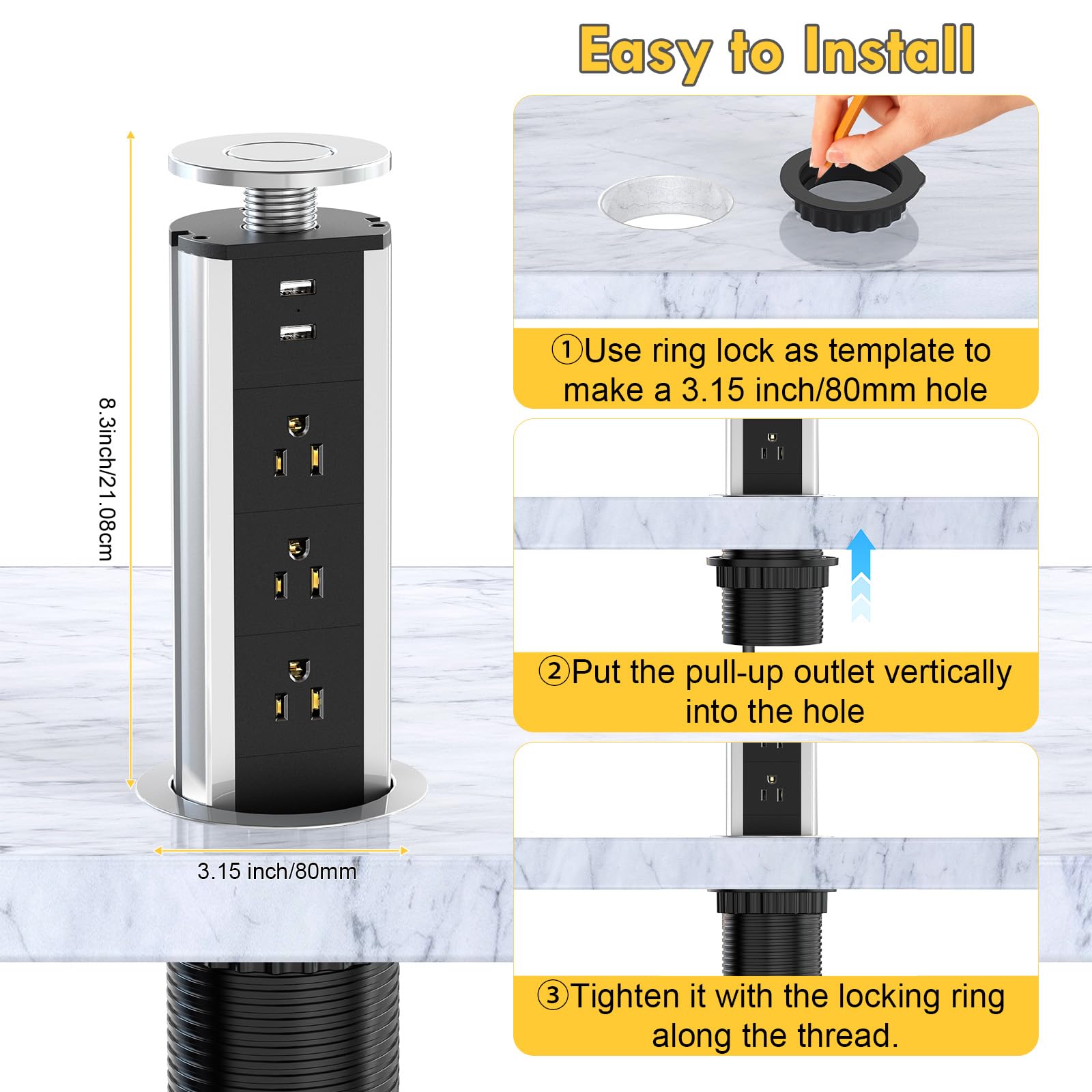 • Reliable Electrical Outlet, with child-friendly pull up/down mechanism. Easy to set-up in your home, office, meeting room, desk, wall and every other place you can imagine.The hole size: 3.15’’±0.1’’ (8.25±0.3cm).