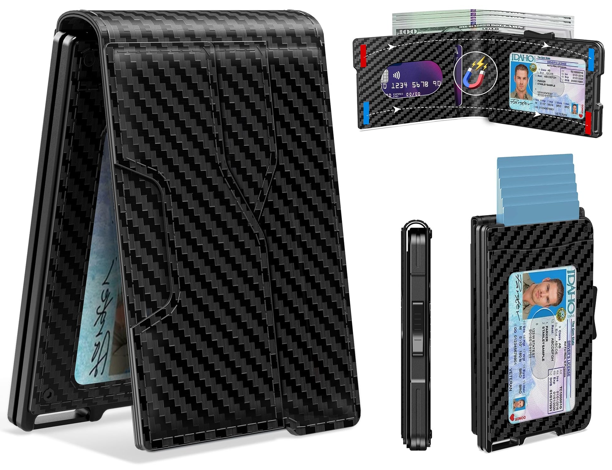 • 【Wallet for Men Vertical】Vertical mens wallet, one-handed tap to access cards. This card holder wallet can store about 15 cards. Aluminum case can store 1-10 cards, 10 cards without letters, 6 cards with letters, 5 cards in the external leather case. The ID window can hold an ID card or driver's license. The built-in cash slot can store 1-13 bills, the built-in magnetic attraction ensures the overall wallet neatness and minimalist.