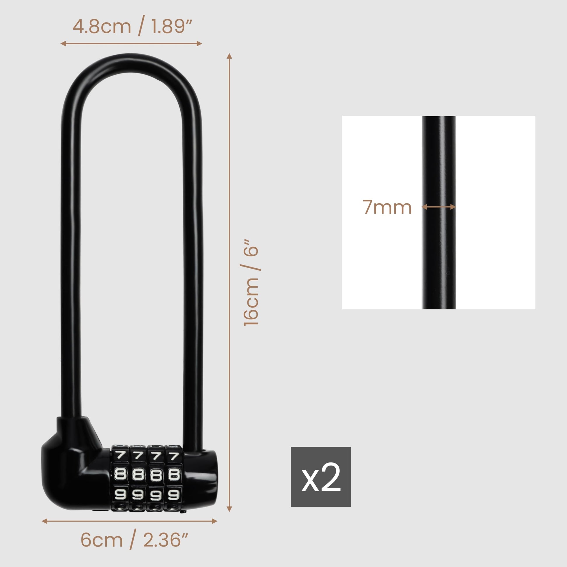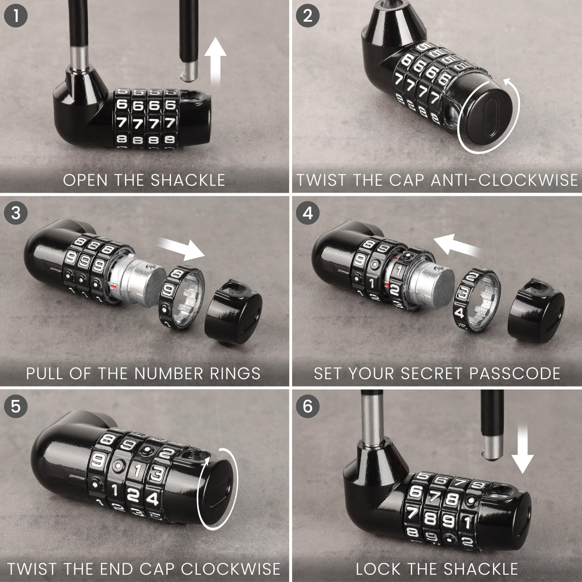 • NO NEED TO CARRY KEYS: Since this is a U combination lock there is no need to carry keys. To create your code, simply remove the loop section of the lock and make sure all the dots are in line with the indicator. Turn the capped end of the lock away from you and pull off the rings. Slide the rings back on with your passcode and put the cap back on. The set comes delivered with full instructions and you can refer to the video on the listing for help also.