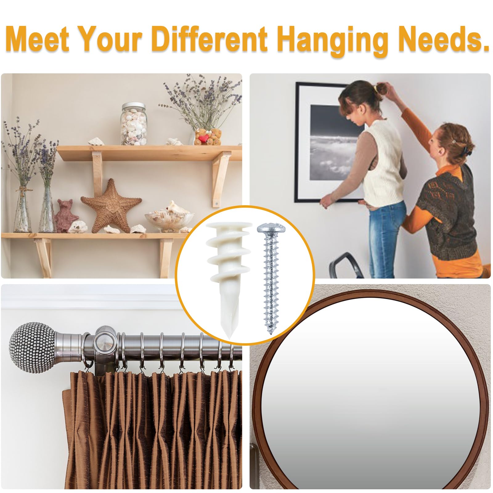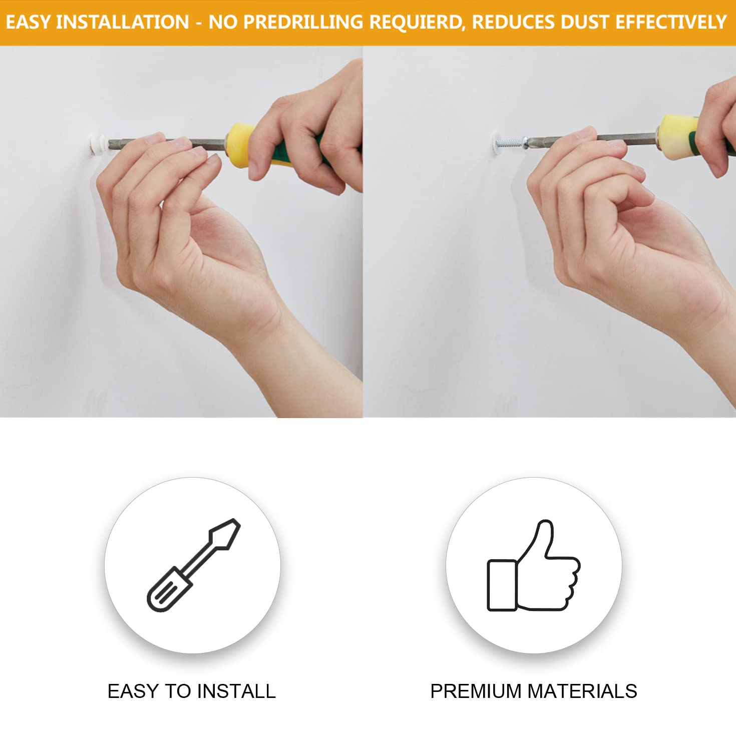 • EASY INSTALLATION WITH SCREWDRIVER – These threaded drywall anchors feature sharp, pointed shanks that can be screwed into the wall without a pre-drilled hole by using a screwdriver or a screw gun, which produces less dust. Once the anchor is in the wall, the screw is inserted, the anchor will wedge tightly against the drywall. These no drill drywall anchors can easily be removed can be reuse.