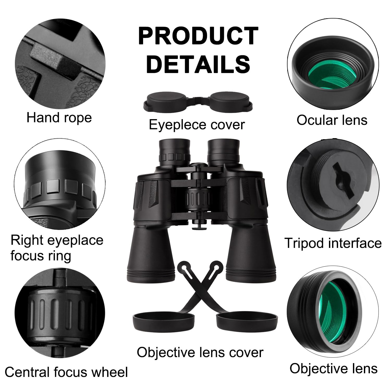 • 【Powerful Large Lens Binoculars】20X power magnification, 26mm eye lens diameter and 50mm objective diameter, wide field of view. Focus on brilliant detail at 1000 yards with a range of 367 ft/1000 yards, easy operate binoculars for adults, perfect choice for bird watching, hunting, travel, opera, concert and sports.
