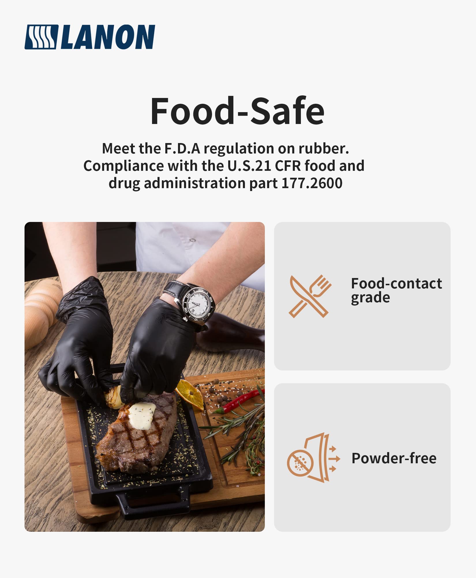 LANON 6-mil Black Nitrile Disposable Gloves, Food-Safe, Powder-Free, Heavy-Duty, Textured Fingertips, Latex-Free, Large
