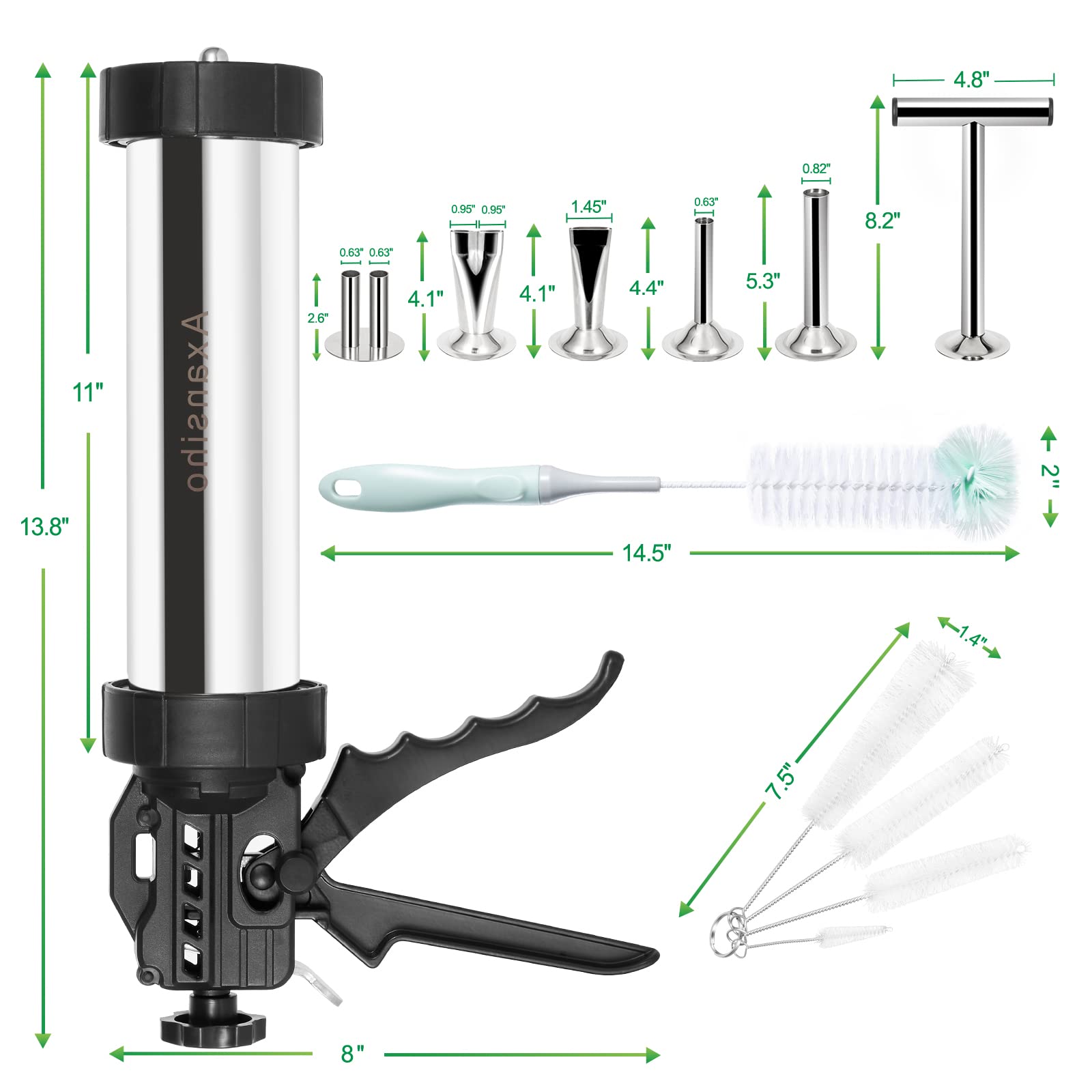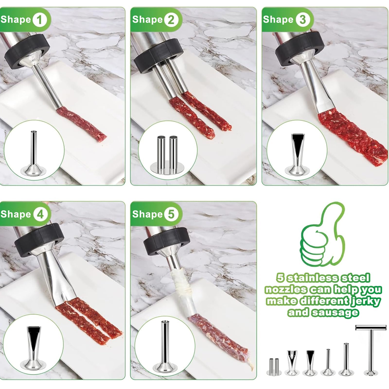 • 【STAINLESS STEEL JERKY GUN】: Our jerky gun kit comes equipped with food grade stainless steel barrel, 5 Stainless Steel Nozzles, 5 Cleaning Brushes and Stainless Steel Meat Pusher. The Stainless Steel Meat Pusher will help you press the meat more tighter so that the tube can hold more meat.