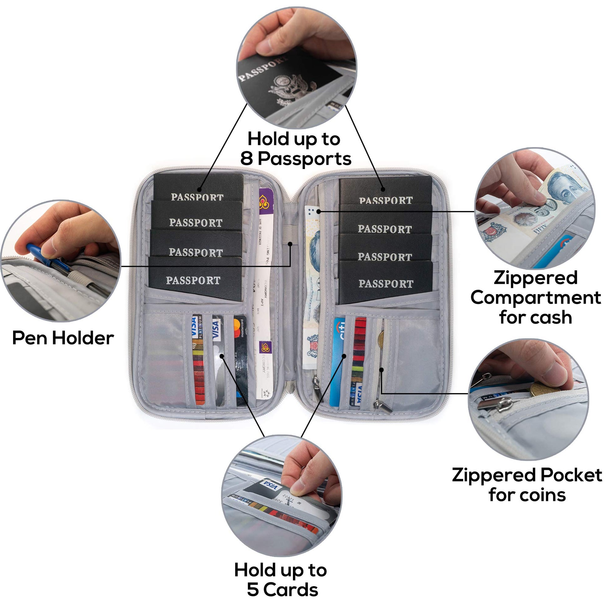 Large Family Passport Holder for 8 | Family Passport Holder for 6 | Multiple Passport Holder Family | Travel Document Organizer w/RFID Blocking,Removable Wrist Strap & Crossbody | Airplane Essentials