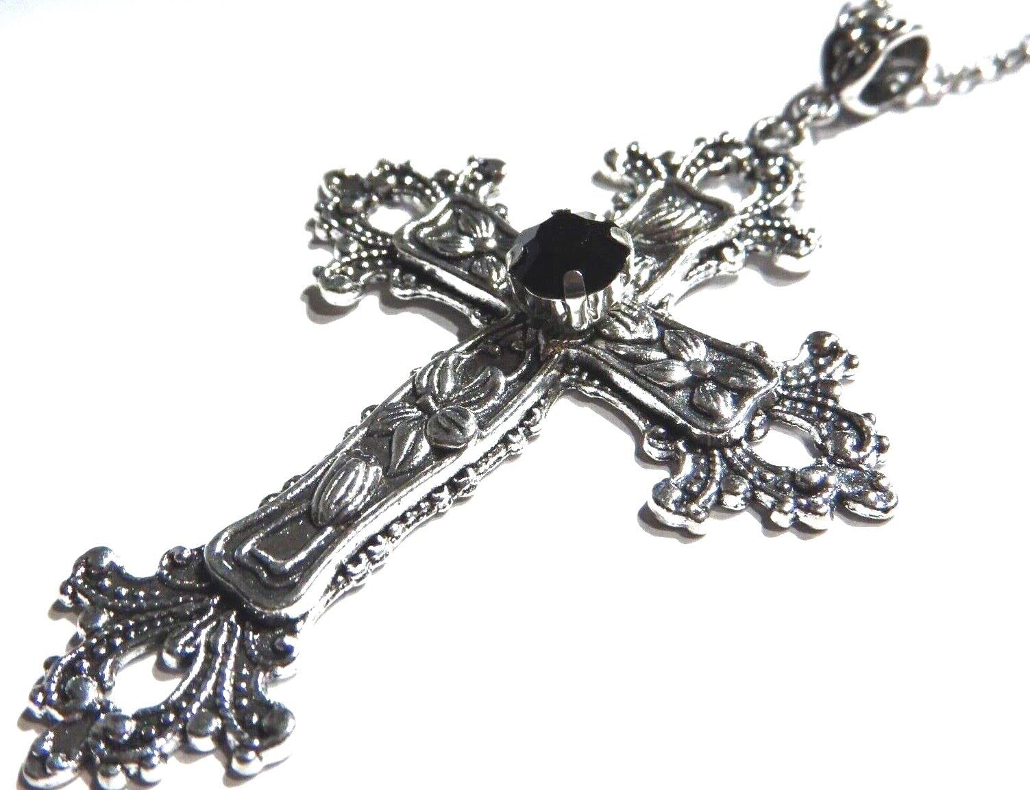 Large Gothic Cross Necklace silver-tone pendant with black glass stone, on 24" steel chain