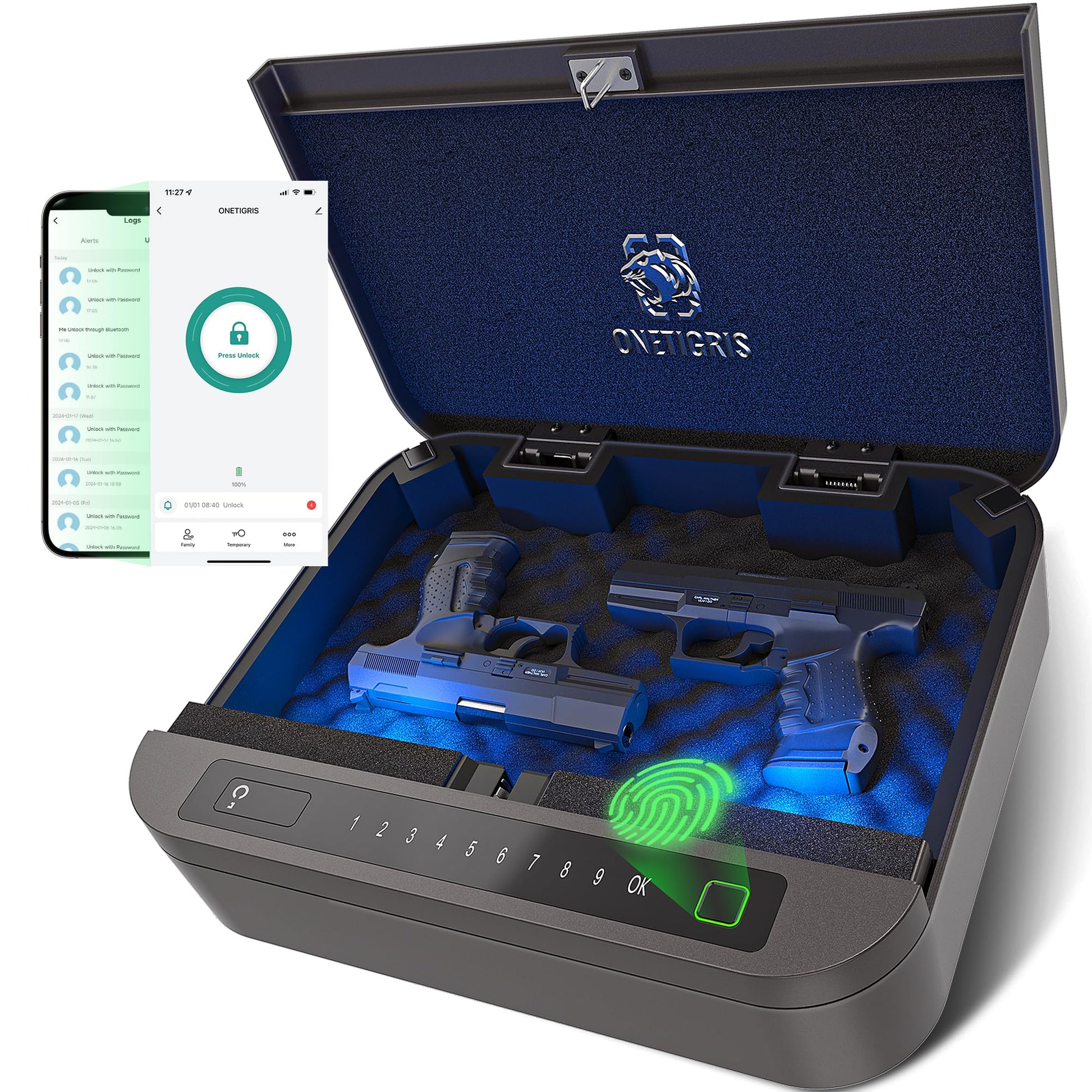 • 0.1S QUICK ACCESS HANDGUN SAFE: In addition to 500 DPI biometric unlocking (up to 100 fingerprints), digital pass code (up to 80 combinations), and two backup keys, the OneTigris biometric fingerprint safe also features APP unlocking for added convenience. Separate switches for sound off (via the App) help conceal the pistol safe in the dark, ensuring your safety in dangerous or emergency situations