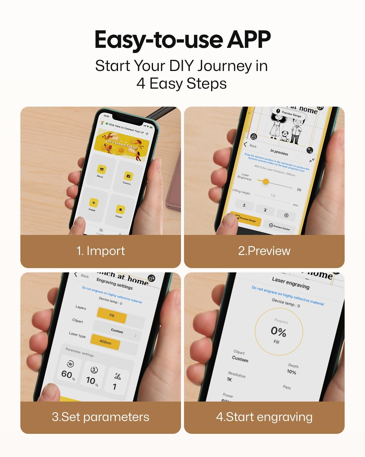 • 3-Step Wood Engraving - No Experience Needed: ① Bluetooth connect ② Set 20cm height ③ Upload designs. Create custom wooden tags/plaques in 4x4' area - 5x faster setup than similar tools.