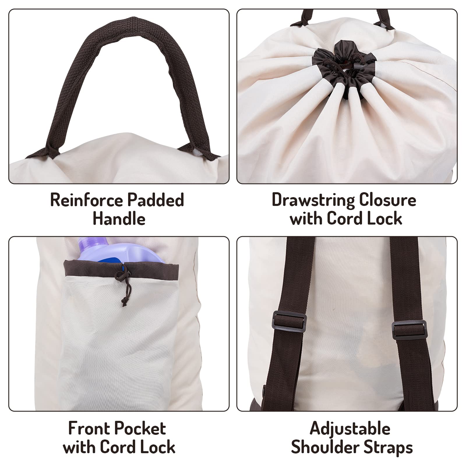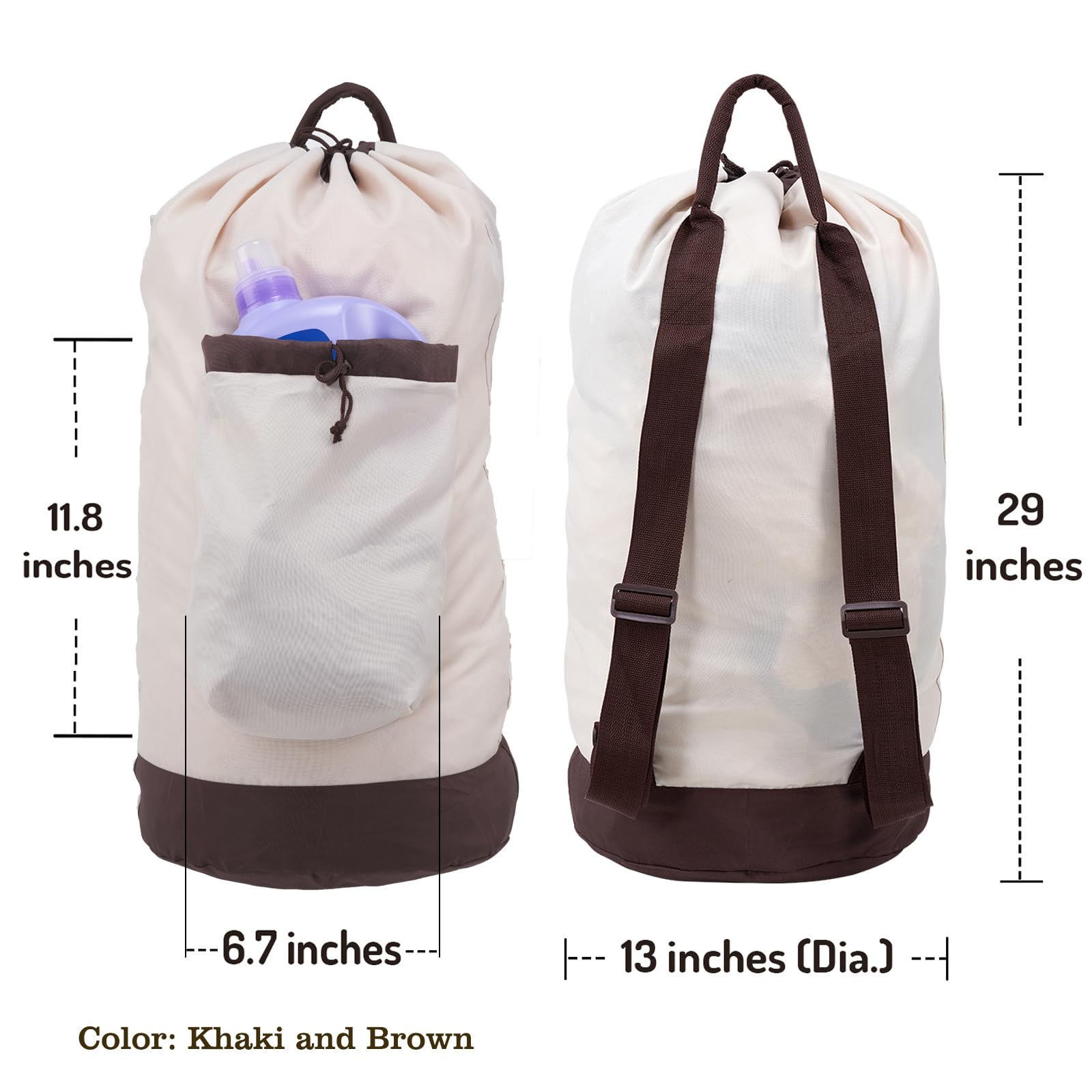 Laundry Bag Backpack with Shoulder Straps and Detergent Holder Clothes, Travel Laundry Backpack Bag Hamper for College Dorm Room (Khaki w Brown)