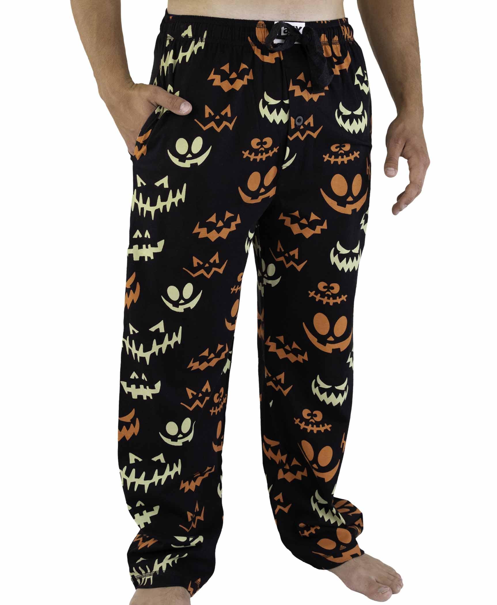 • FUNNY DESIGNS: This pair of pajama pants features a humorous design of scary carved pumpkin faces. These novelty pants are sure to make you laugh with their clever jokes.