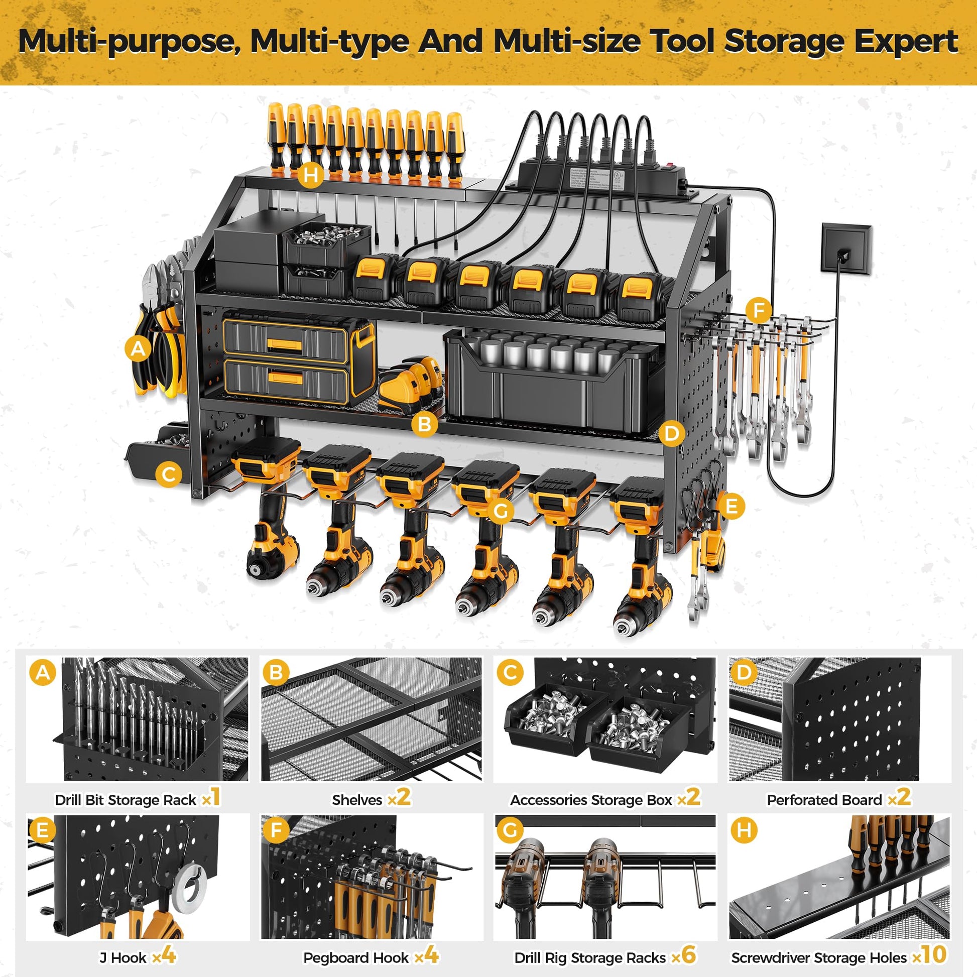 • 【Built-in 6-Outlet Power Strip】Power tool organizer with charging station can charge 6 power tools at the same time, American standard power strip design and the metal power strip with surge protection of 1200J, Able to protect your device to a certain extent, Output: 125V/15A/1875W