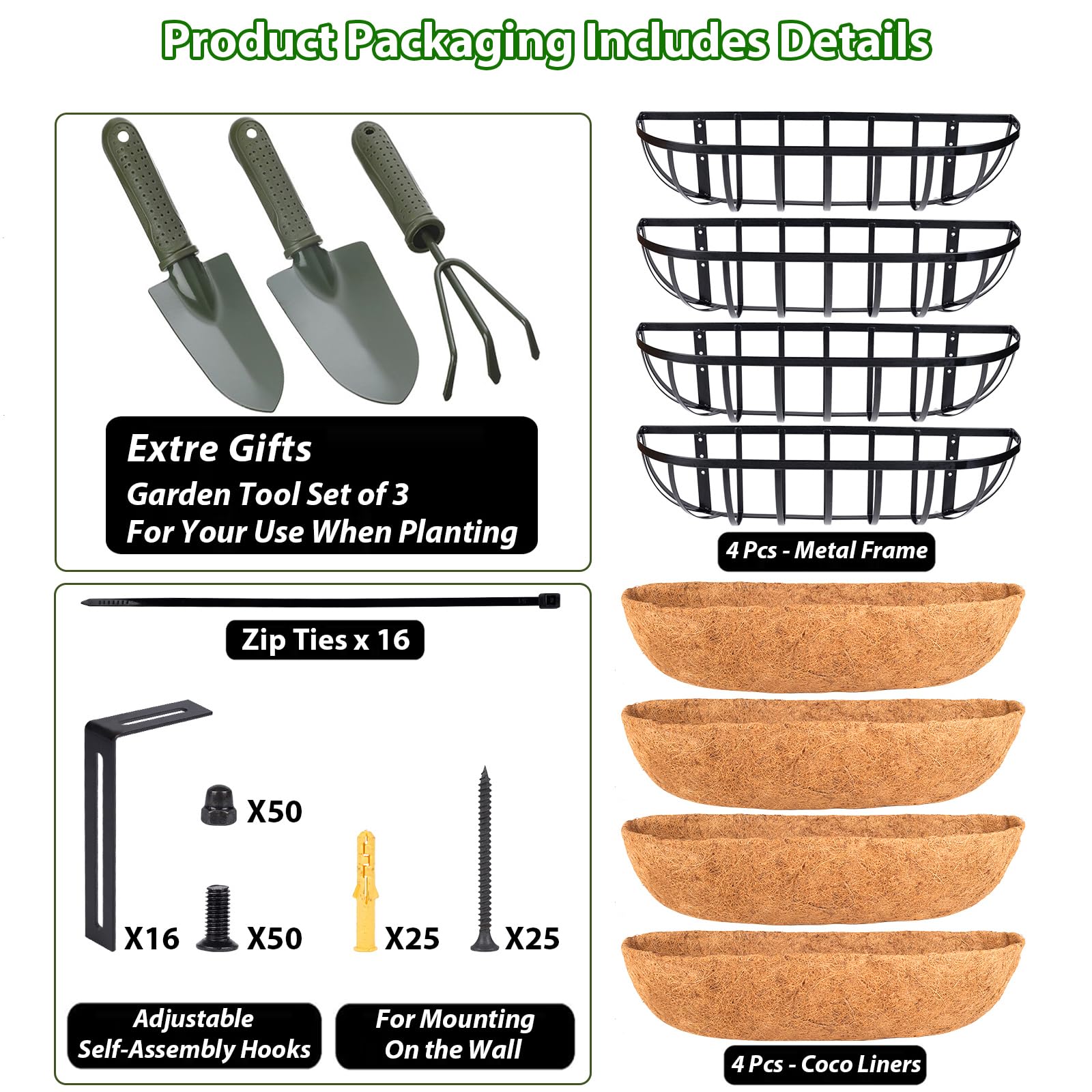 • 🌺【Popular Choice for Growers】You will get a pack of 4 Hanging Baskets with a length of 24 inches and a depth of 7.1 inches, each basket contains a natural coconut liner. ★Plus, we'll give you a free garden tool kit. Fits great for your flowers and green plants!