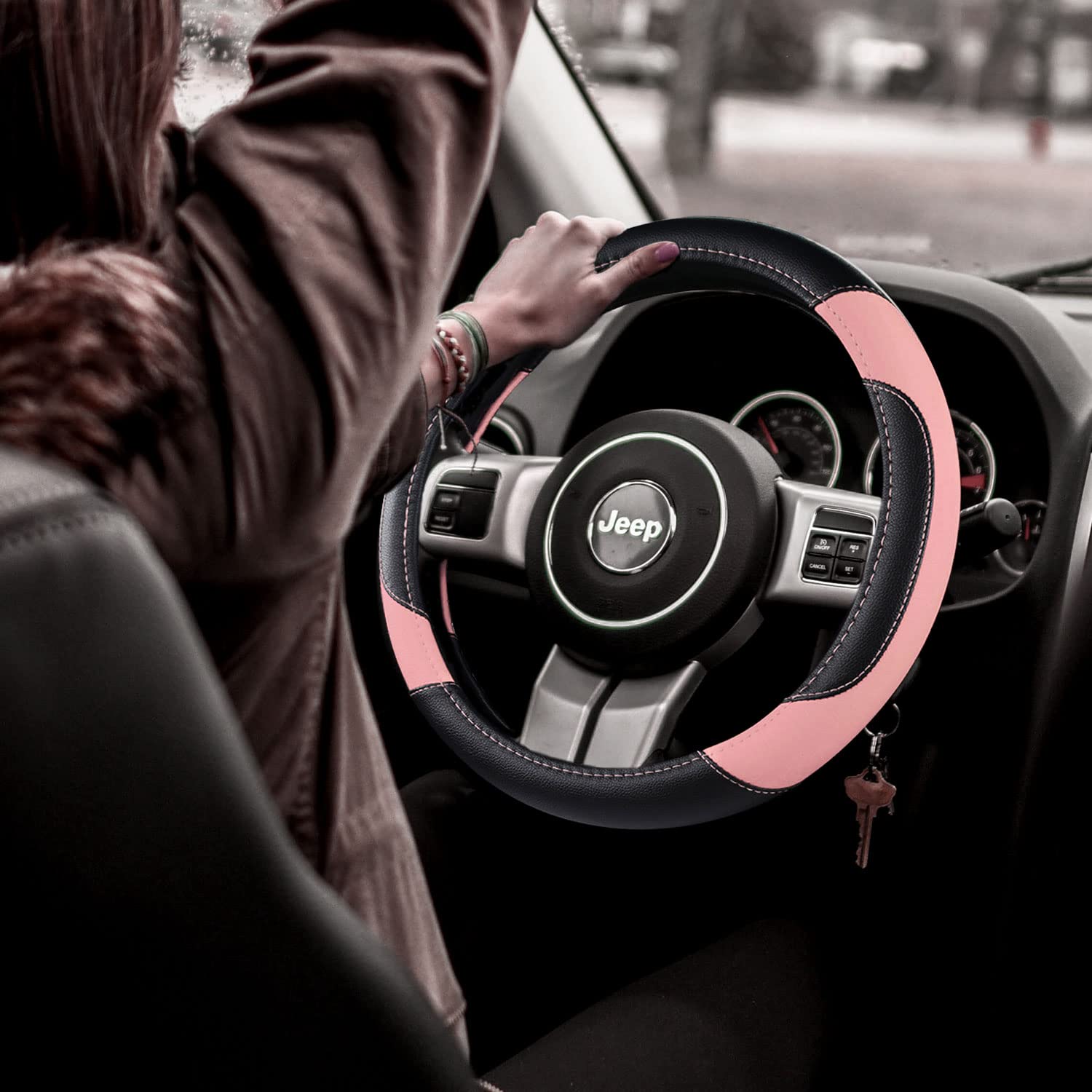 Leather Car Steering Wheel Cover, Non-Slip Car Wheel Cover Protector Breathable Microfiber Leather Universal Fit for Most Cars(Pink)