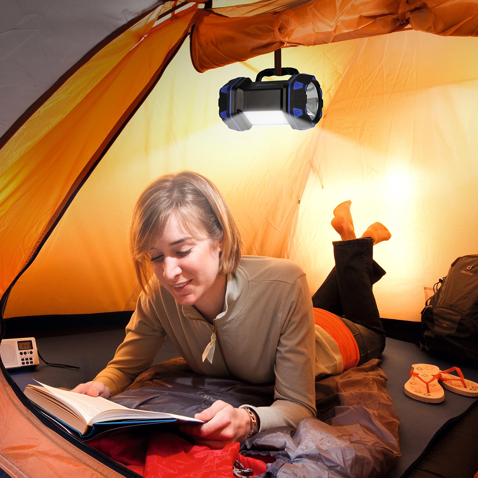 • [HIGH BRIGHTNESS] - This camping lights rechargeable main beam gives out brightness up to 1500 lumen with a long illumination distance of 500m (1640ft), Cast bright light for your activities, hiking, fishing, hunting, camping, outdoor emergencies