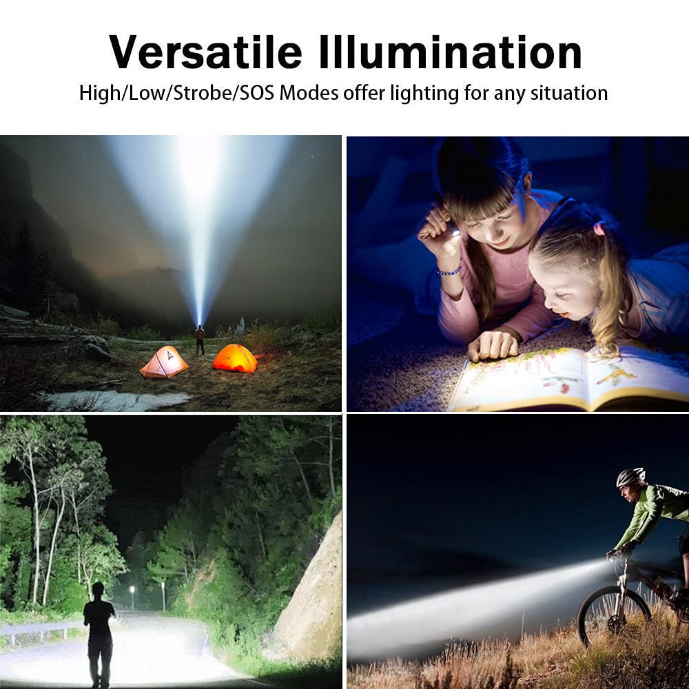 • LED Flashlight Zoomable, 4Modes --- High powered rechargeable flashlight, Easily strech out the flashlight body can get a wide-to-narrow beam zoom, makes this LED flashlight ideal for use around the house, dog walking, or camping. Tactical Flashlight high Lumen have 4 modes: High / Medium / Low / Strobe, strobe mode will keep you safe in any situation.