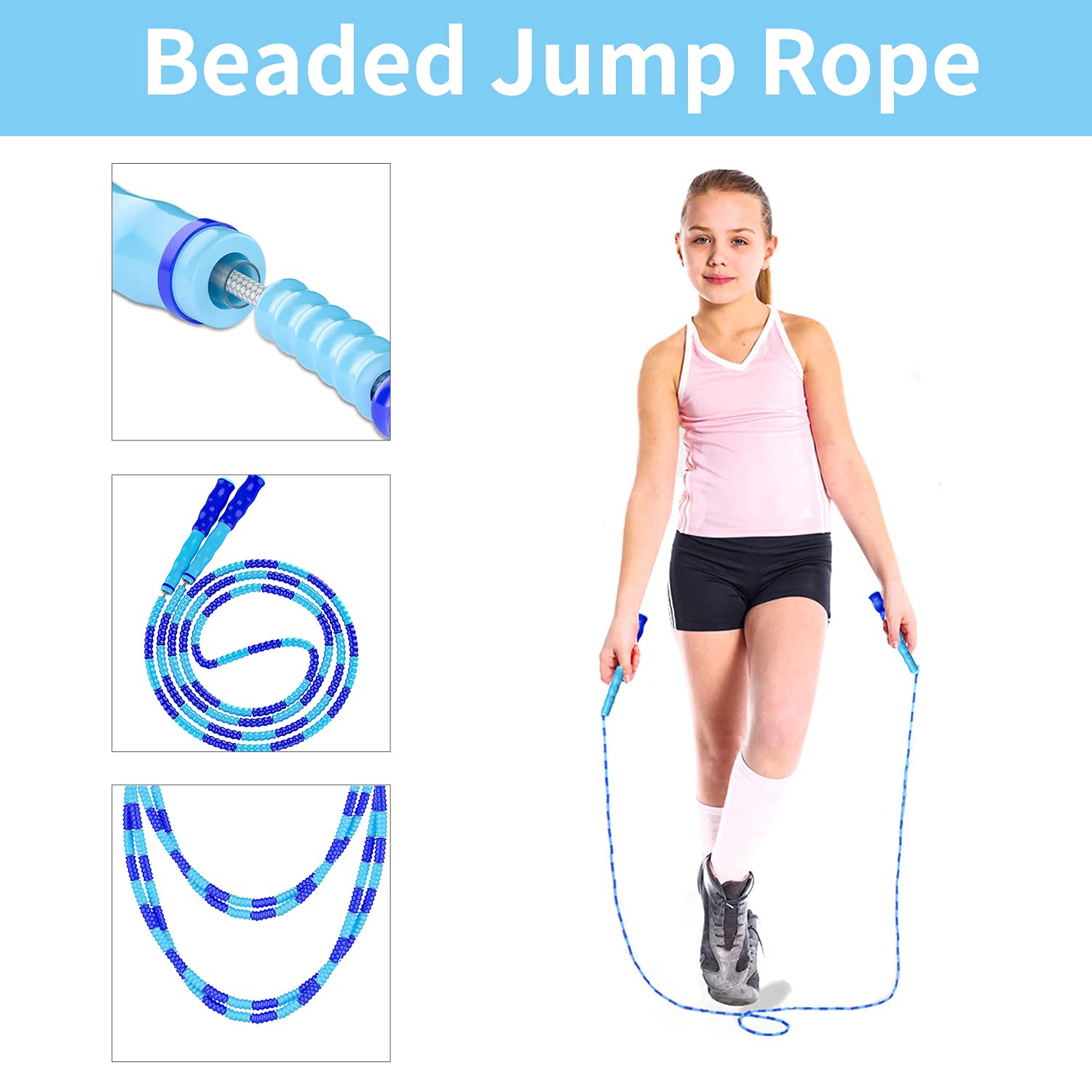 • 【Feel the Rhythm】: Soft beaded makes that “tick tick” clicking sound on pavement or gym floors, helpful for developing kids jump rope rhythm. So jumping rope with this rhythm is perfect for outdoor, exercise, and fitness.