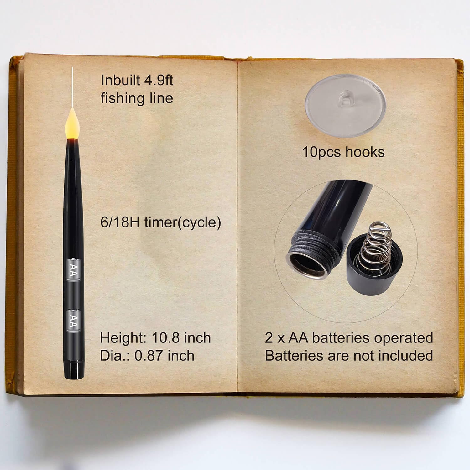 • Package: Each set contains 10 pieces of 0.87'(D)×10.8'(H) LED black candles, 1 plastic magic wand remote control of 14 inches in length, 1 user manual and 10pcs of stick hooks.