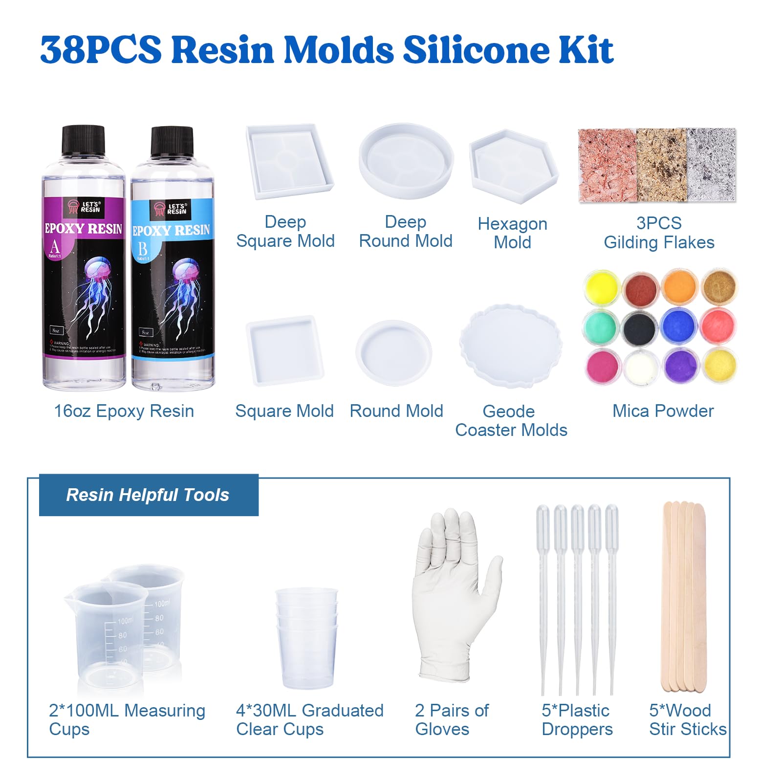 • Everything You Need:The LET'S RESIN resin kit with molds contains everything you need for resin coaster making. It comes with a 16oz epoxy resin kit, coaster molds, mixing cups, mica powder, golden flakes, gloves, and more, which is more than sufficient to kickstart your creative journey