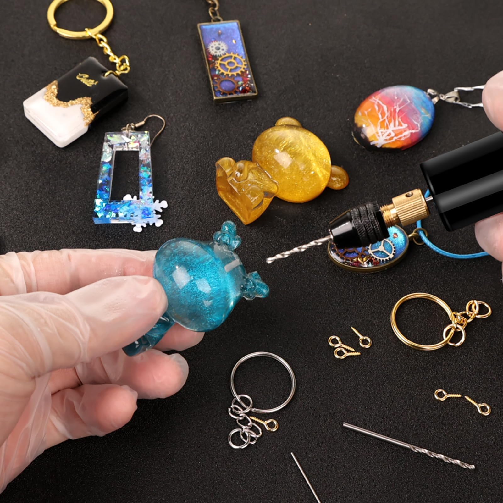 • Practical Electric Hand Drill Tools: LET'S RESIN electric punching tool kit includes 1pc electric hand drill, 1pc 3-jaw clamp, 1pcs wrench, 1pcs grip nose plier, 10 pcs drill bits of different lengths, 10 pcs keychain with jump rings (5pcs silver, 5pcs gold), 50pcs screw eye pins (25pcs silver, 25pcs gold). Instructions are attached to help you use it better. The keychain making kit is your best choice for making jewelry, keyrings, home decor, wall hangings, engraving, and more.