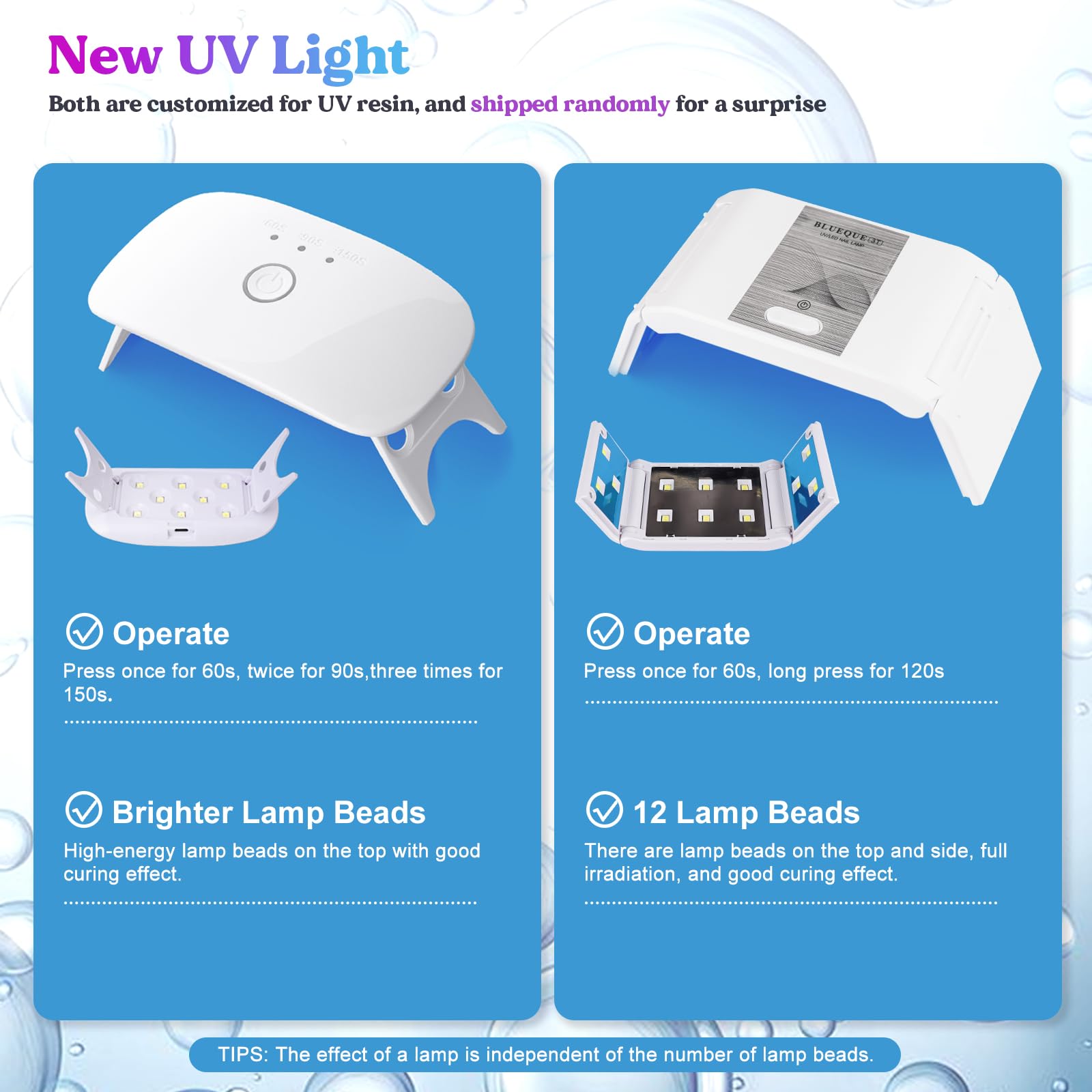 • More Efficient Tools: Comparing many UV lights, we selected this UV lamp to improve your work efficiency, the higher the power, the shorter the curing time. The light has 8 lamp beads, which can fully Irradiate your crafts. Press once, it turns off after 60s, long press for 3s, and turns off after 120s. We are also equipped with mixing tools and a silicone mat. They can help you keep the desktop clean during operation, and can mix a variety of colors to create more unique UV resin works.